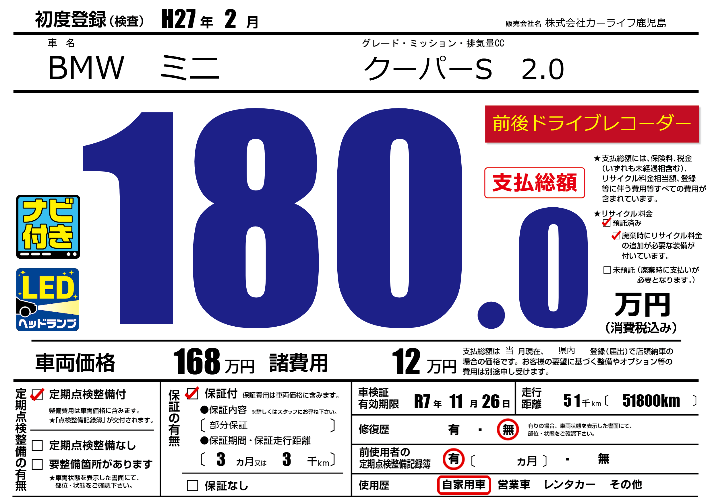 | 車名 | BMW ミニ | グレード ミッション 排気量 |
