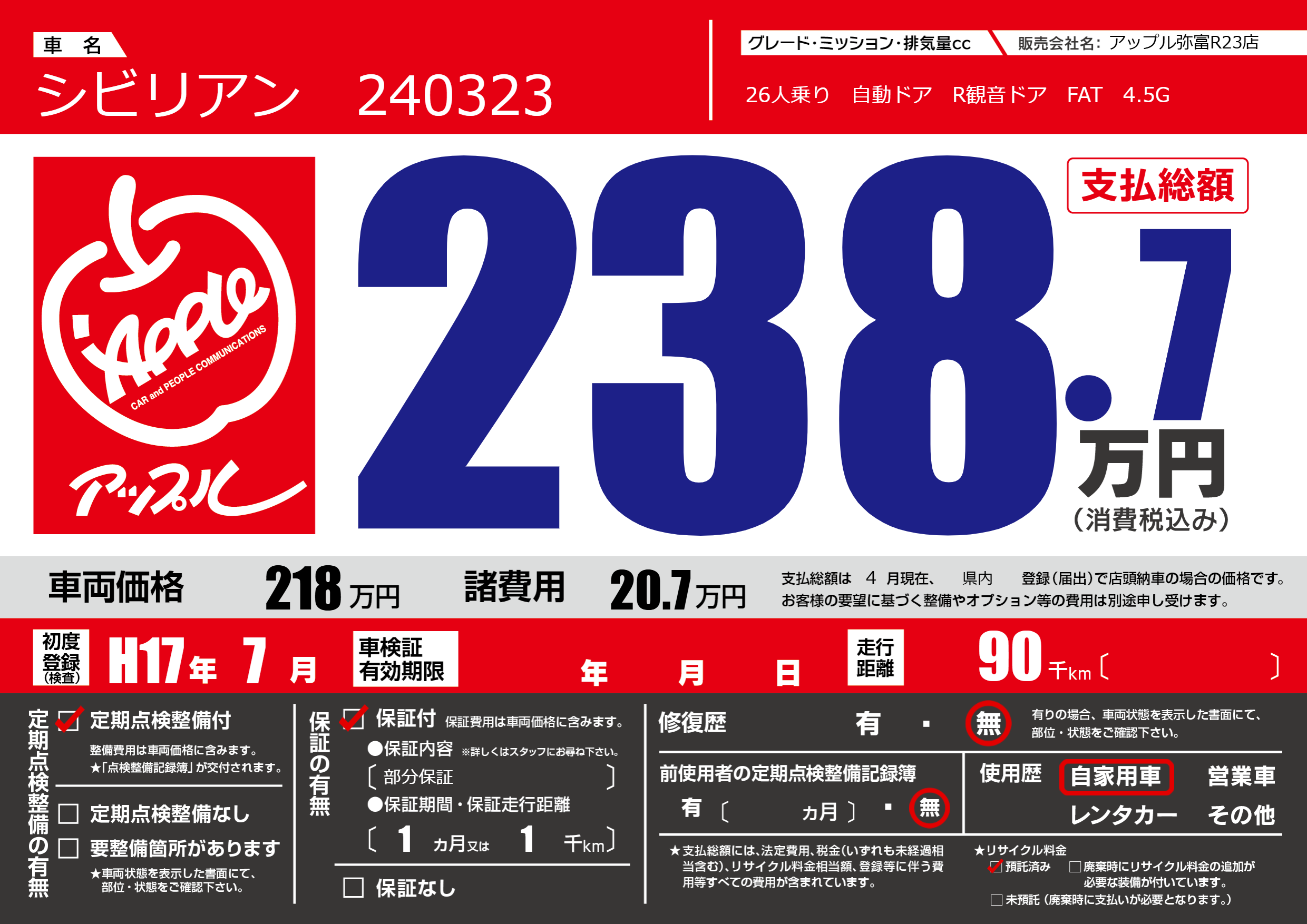 | 車名 | シビリアン 240323 | グレード ミッション 排気量 |