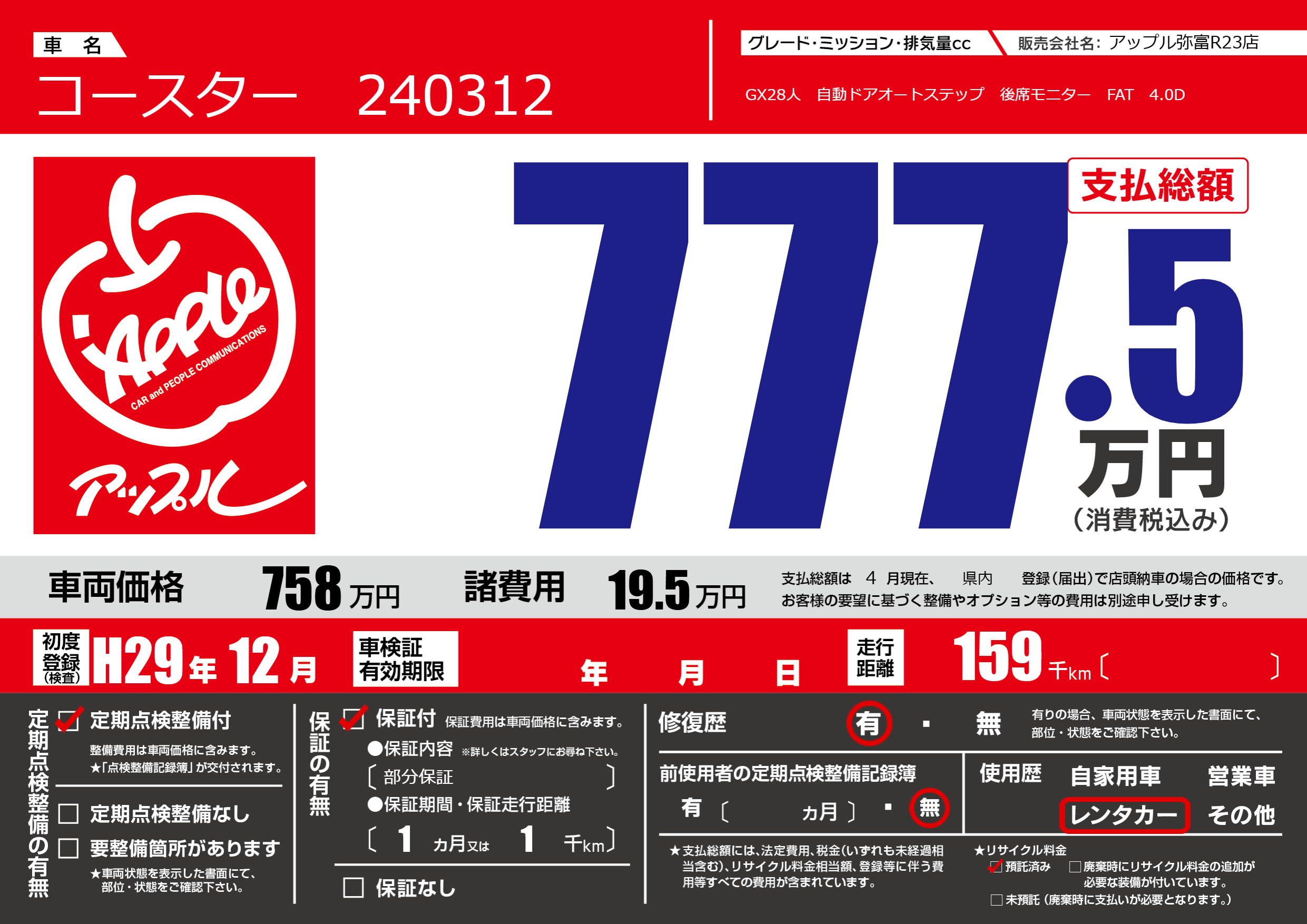 | 車名 | コースター 240312 | グレード ミッション 排気量 |