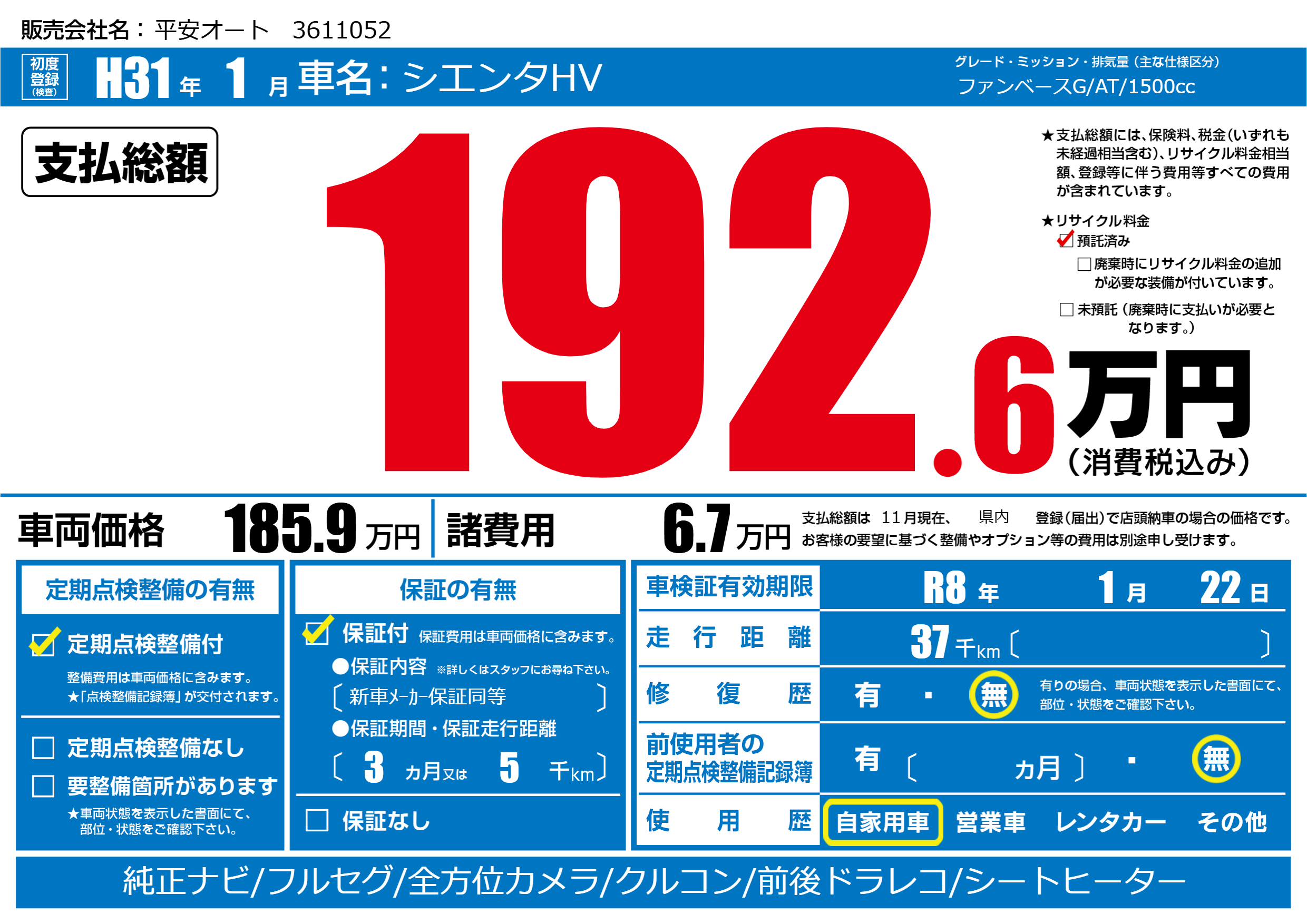 なし | 車検制限 | R8年1月22月 |
