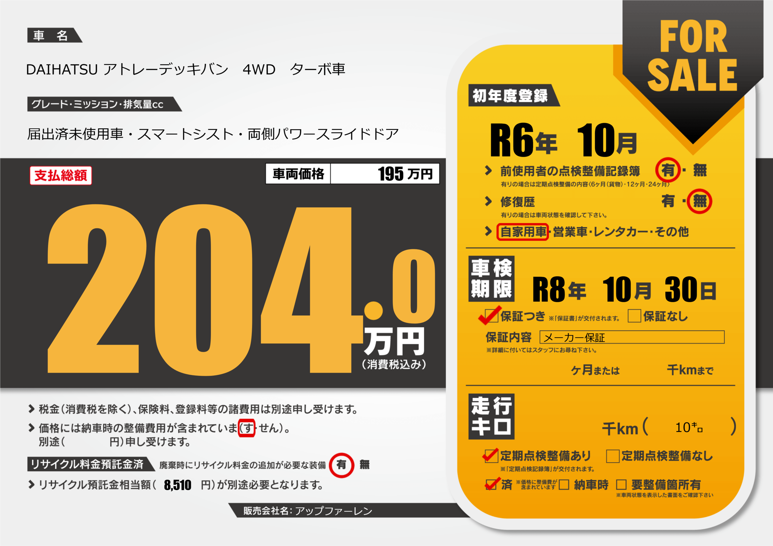 | 定期点検整備 | 定期点検整備あり 定期点検整備済み | ||