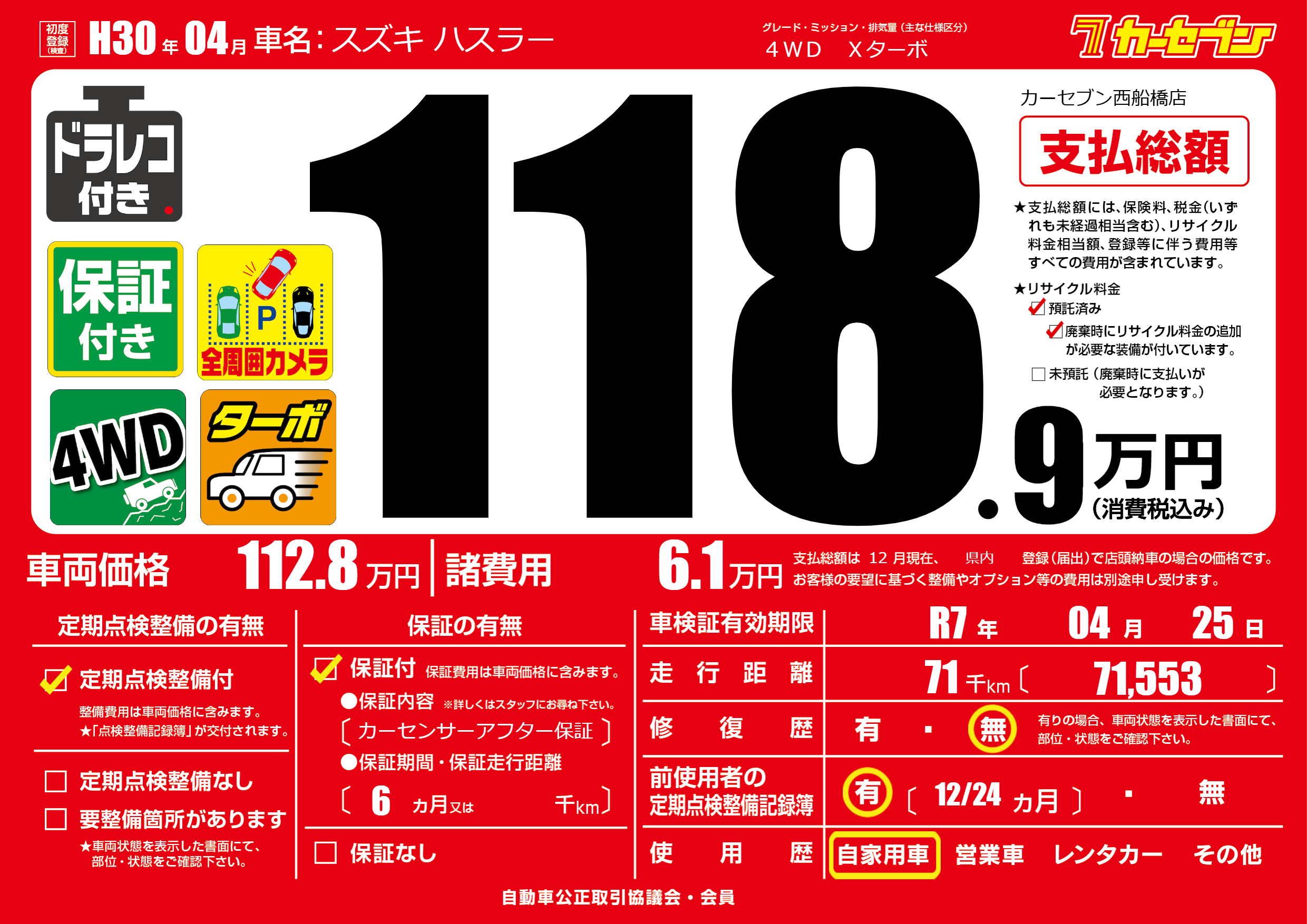 | 走行キロ | 7.1万km | 初年度登録 | H30年04月 |