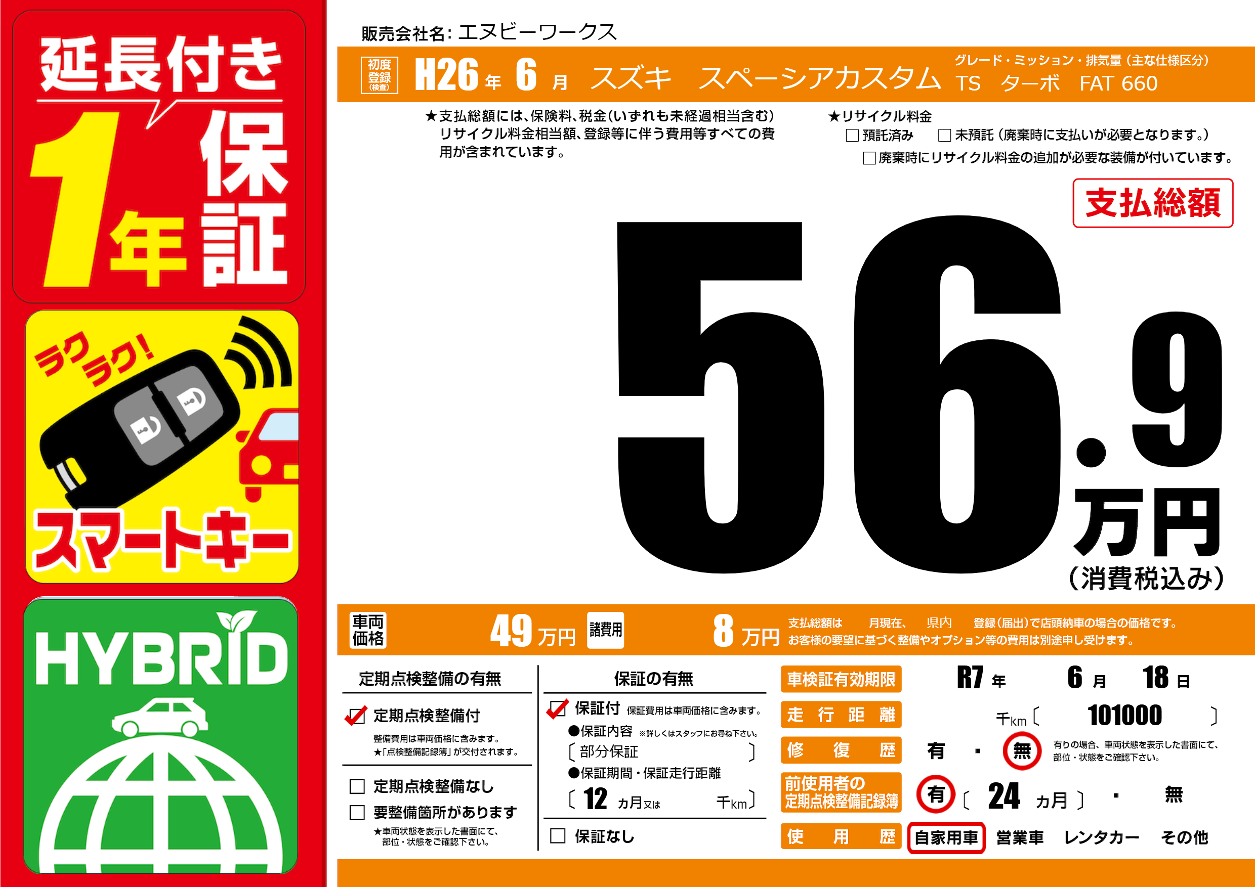 | 車名 | スズキ スペーシアカスタム | グレード ミッション 排気量 |