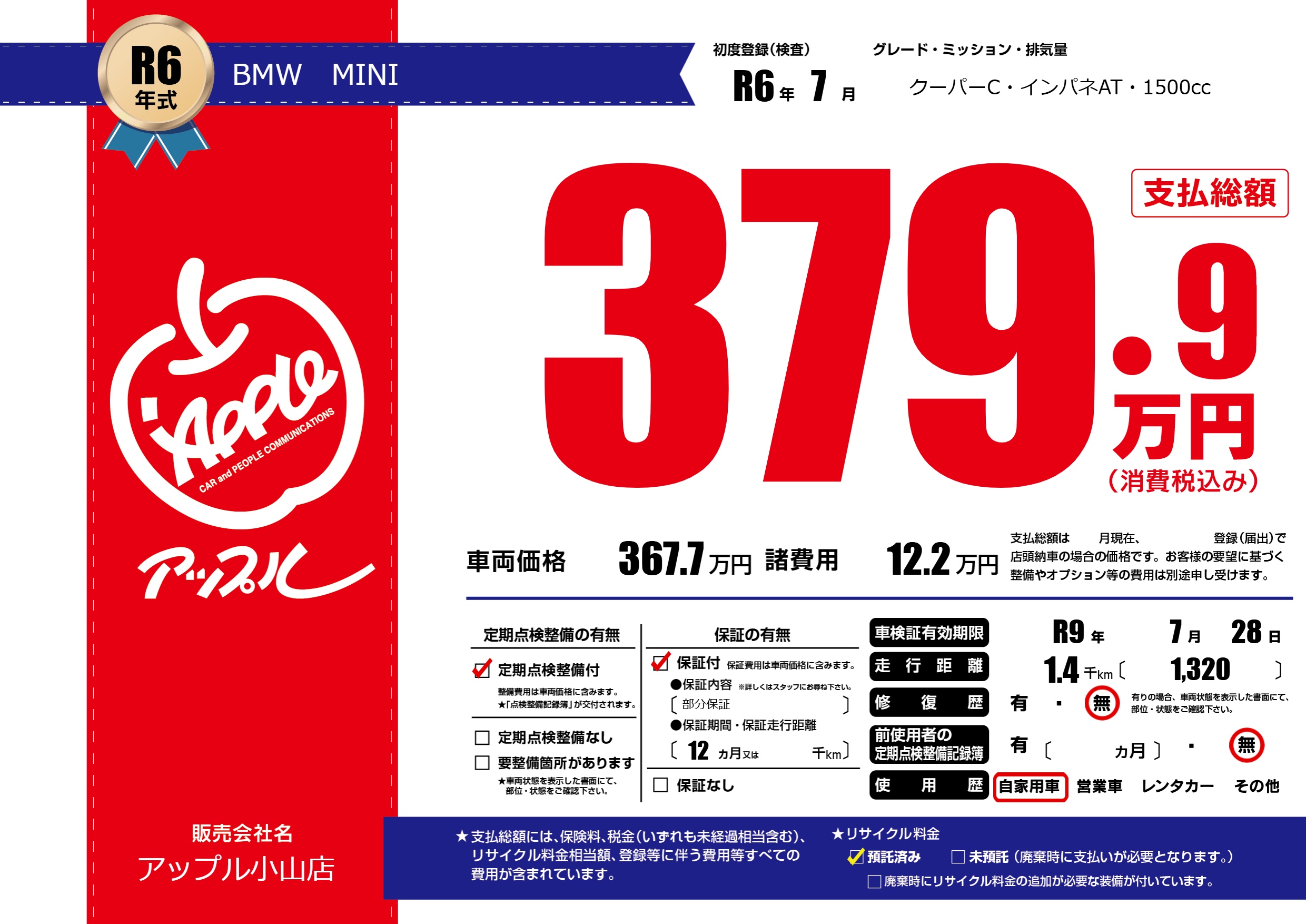 | 車名 | BMW MINI | グレード ミッション 排気量 |
