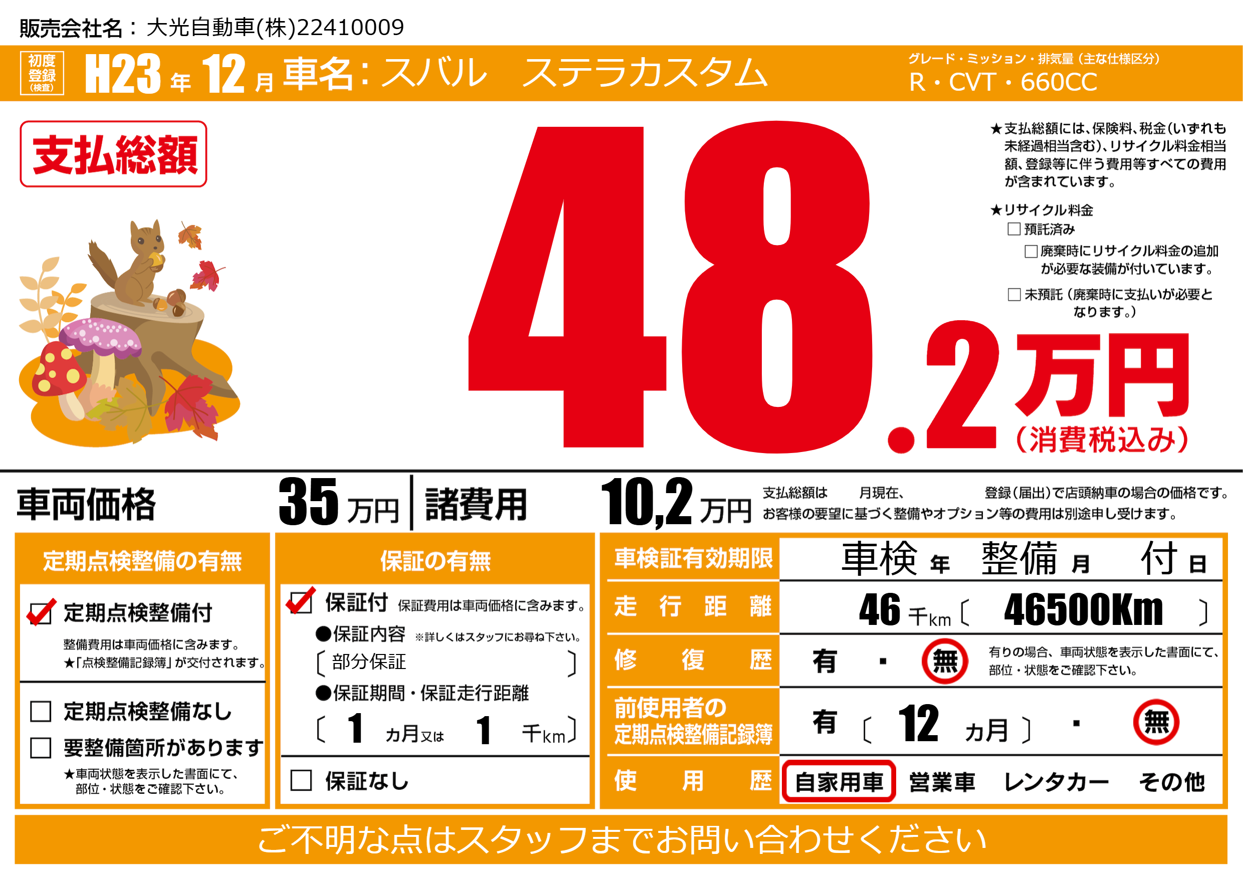 | 走行キロ | 4.6万km | 初年度登録 | H23年12月 |