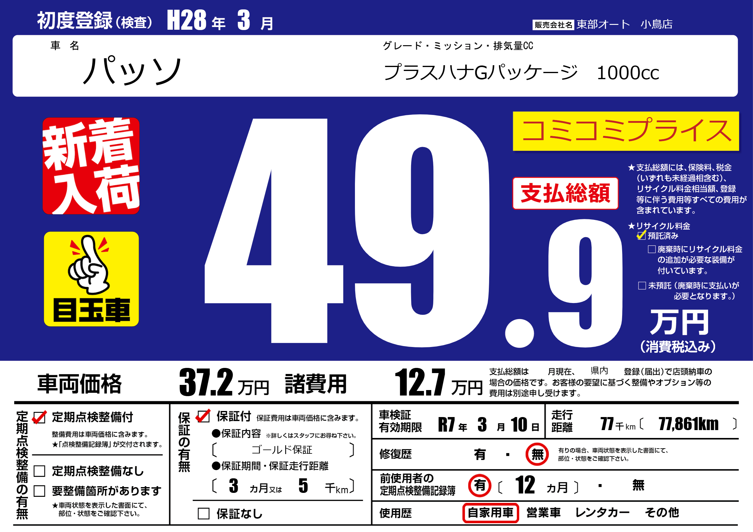 | 車名 | パッソ | グレード ミッション 排気量 |