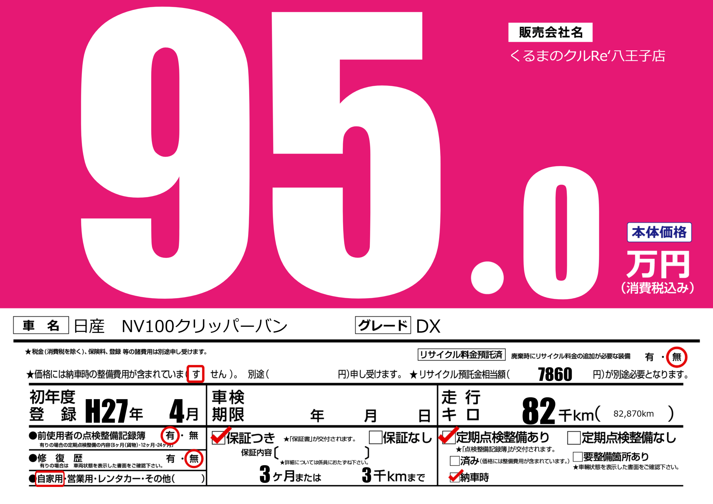 | 車名 | 日産 NV100クリッパーバン | グレード ミッション 排気量 |