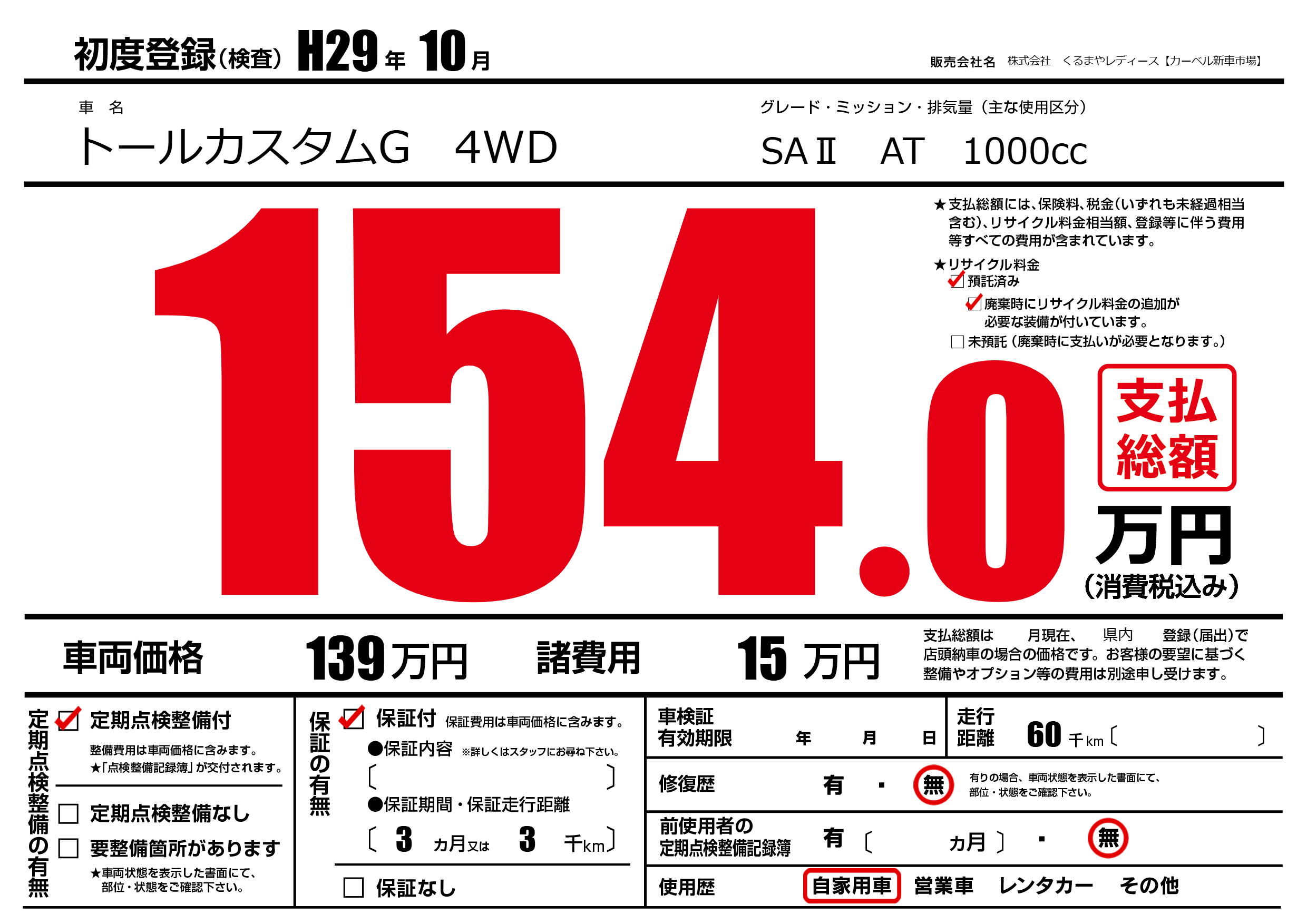 | 車名 | トールカスタムG 4WD | グレード ミッション 排気量 |