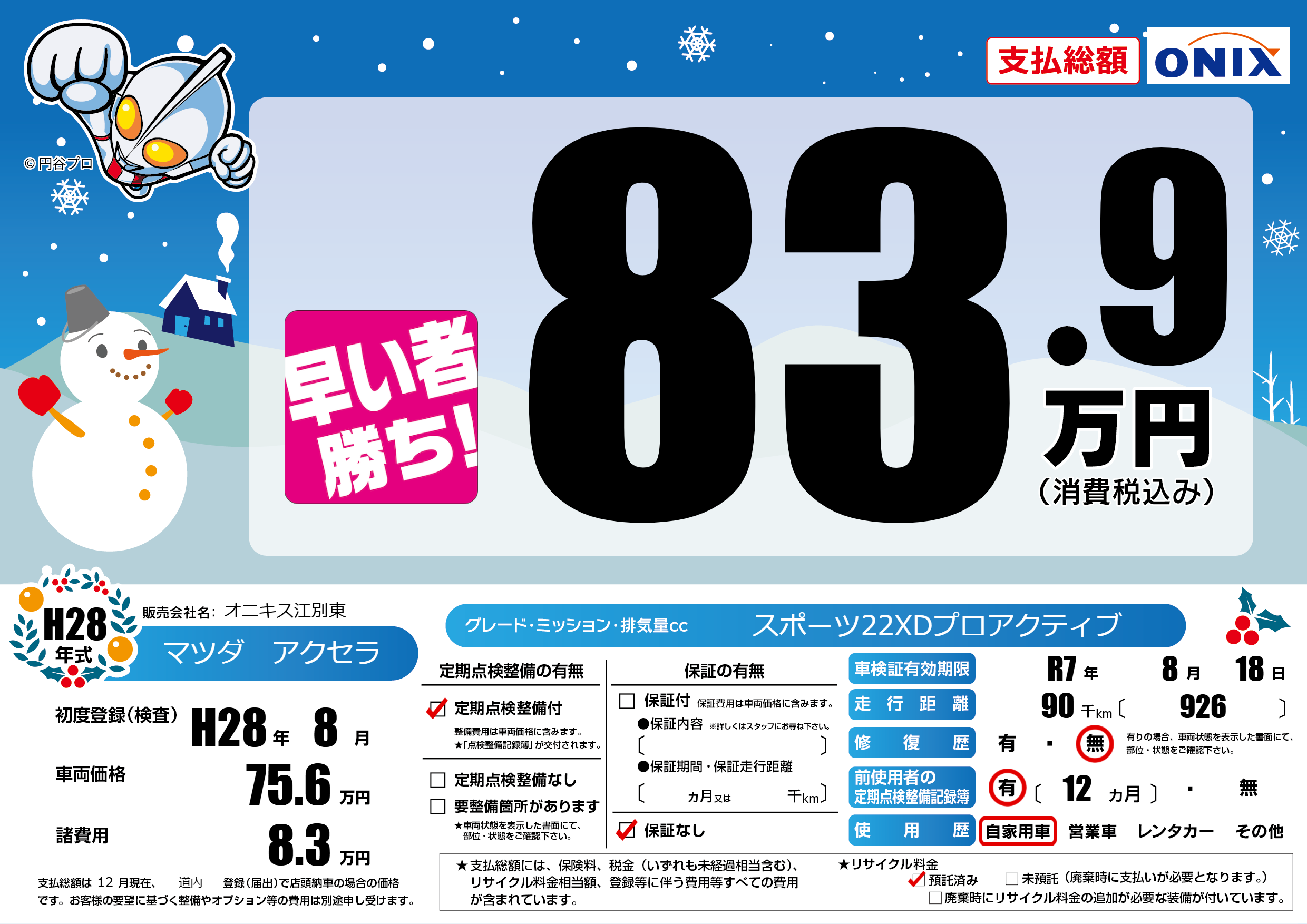 | 走行キロ | 9万km | 初年度登録 | H28年8月 |
