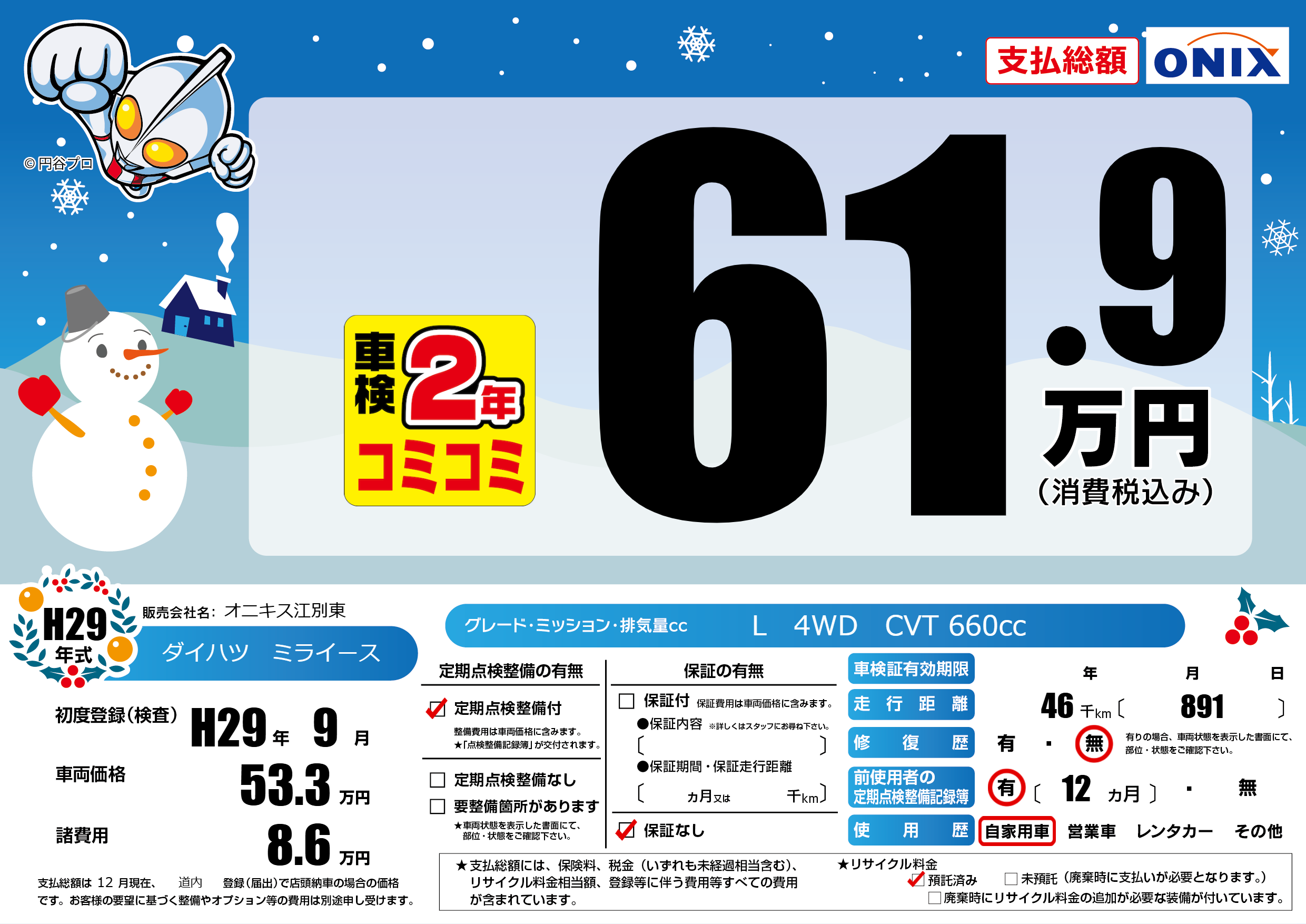 | 車名 | ダイハツ ミライース | グレード ミッション 排気量 |