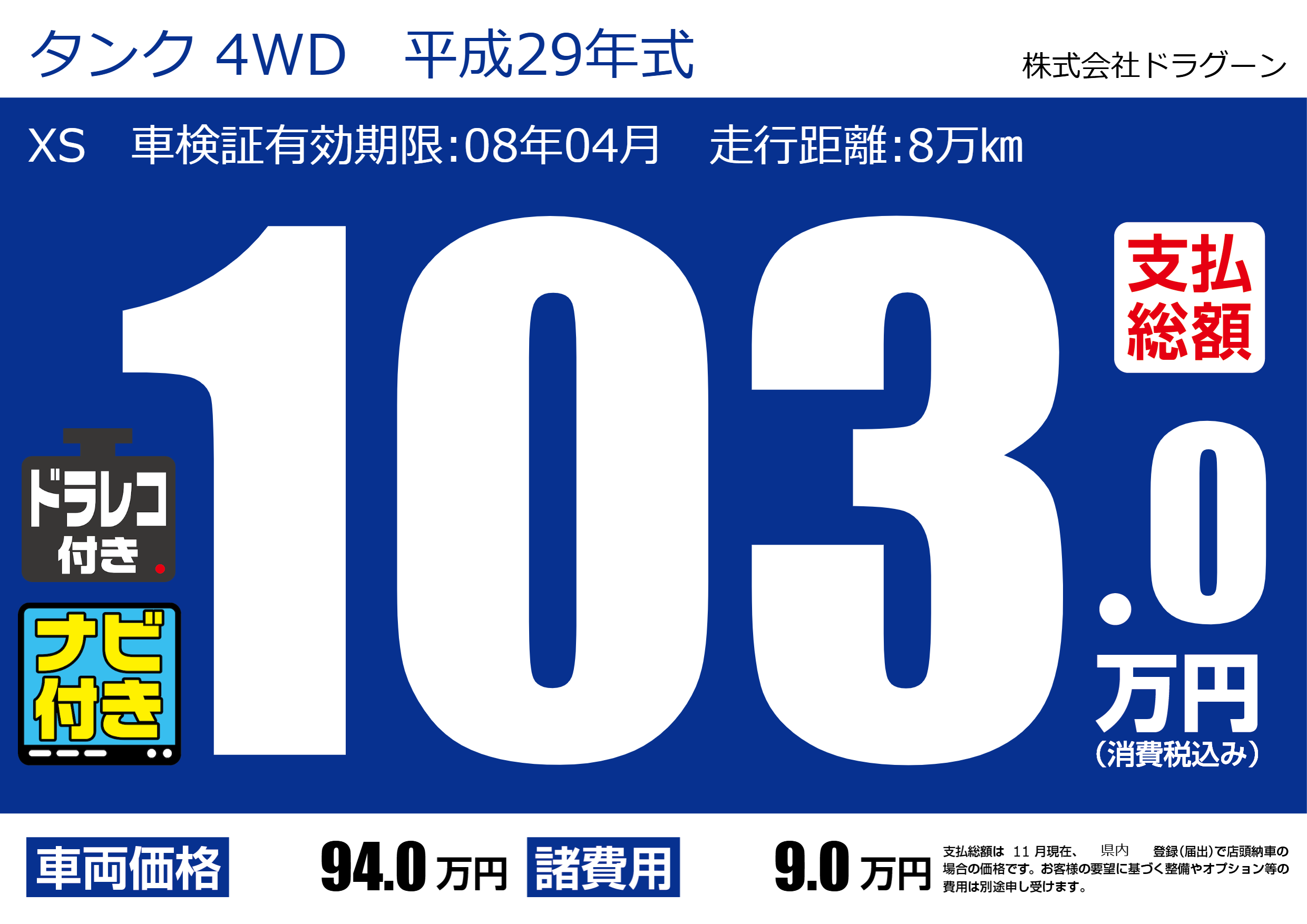 | 車名 | タンク 4WD 平成29年式 | グレード ミッション 排気量 |
