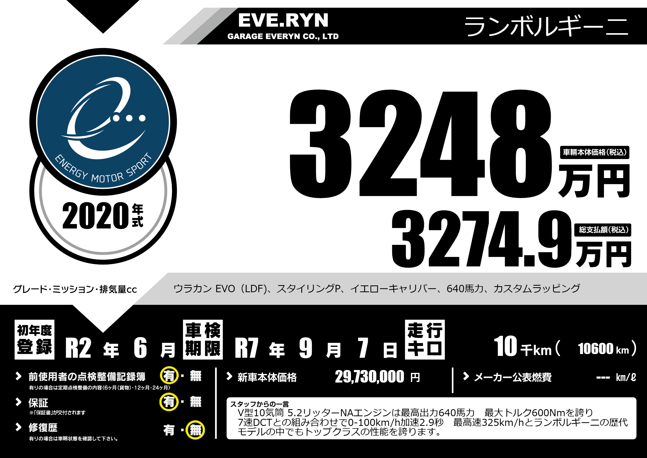 ウラカン EVO(LDF)、スタイリングP、イエローキャリパー、640馬力、カスタムラッピング |