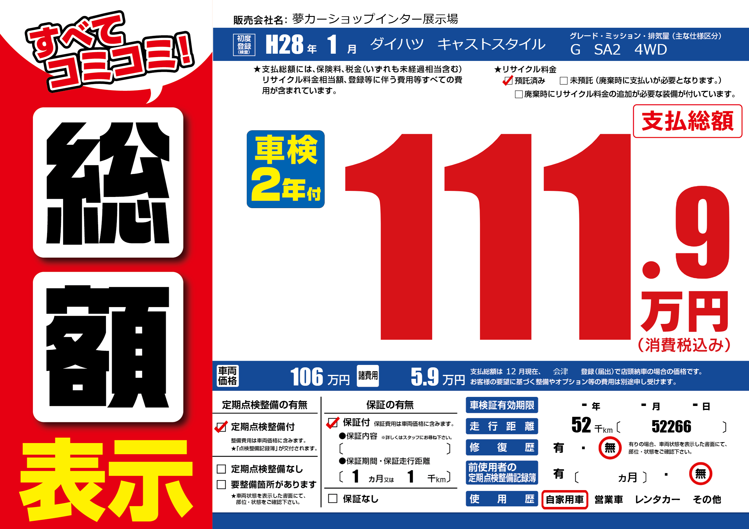 | 車名 | ダイハツ キャストスタイル | グレード ミッション 排気量 |