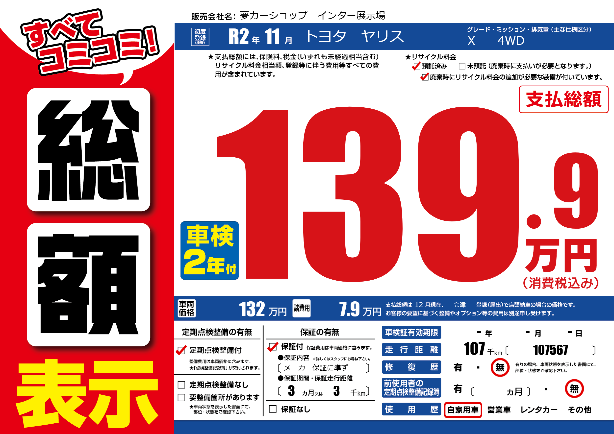 | 車名 | トヨタ ヤリス | グレード ミッション 排気量 |