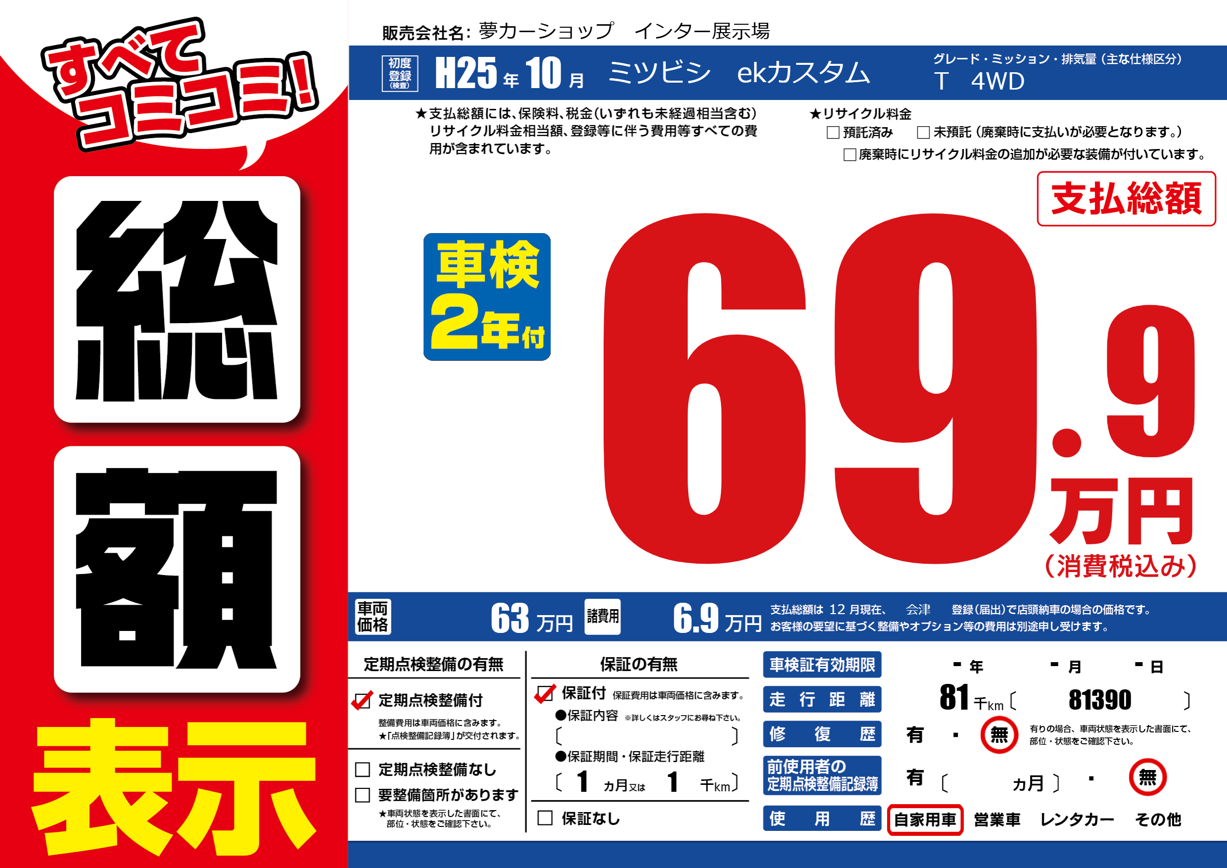 | 走行キロ | 8.1万km | 初年度登録 | H25年10月 |