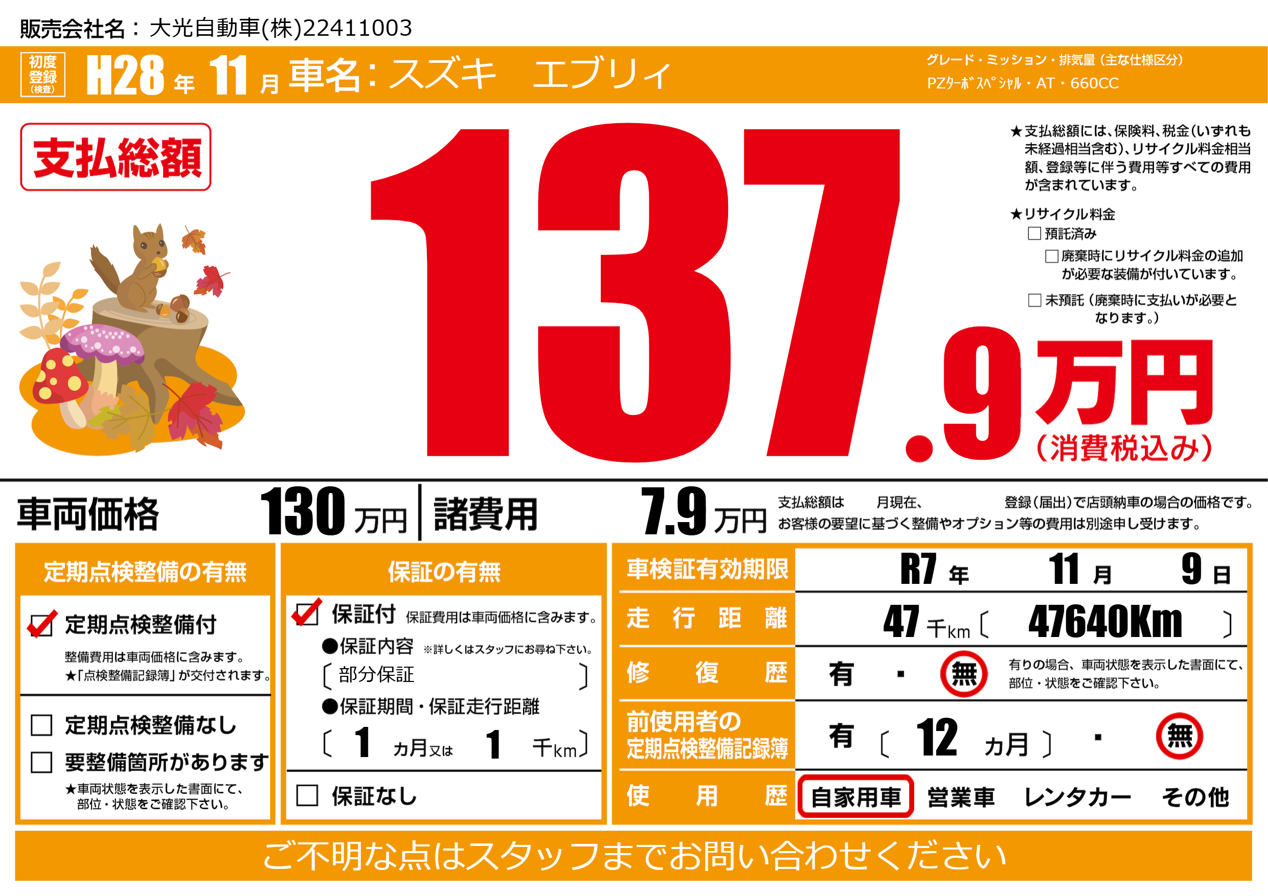 | 走行キロ | 4.7万km | 初年度登録 | H28年11月 |