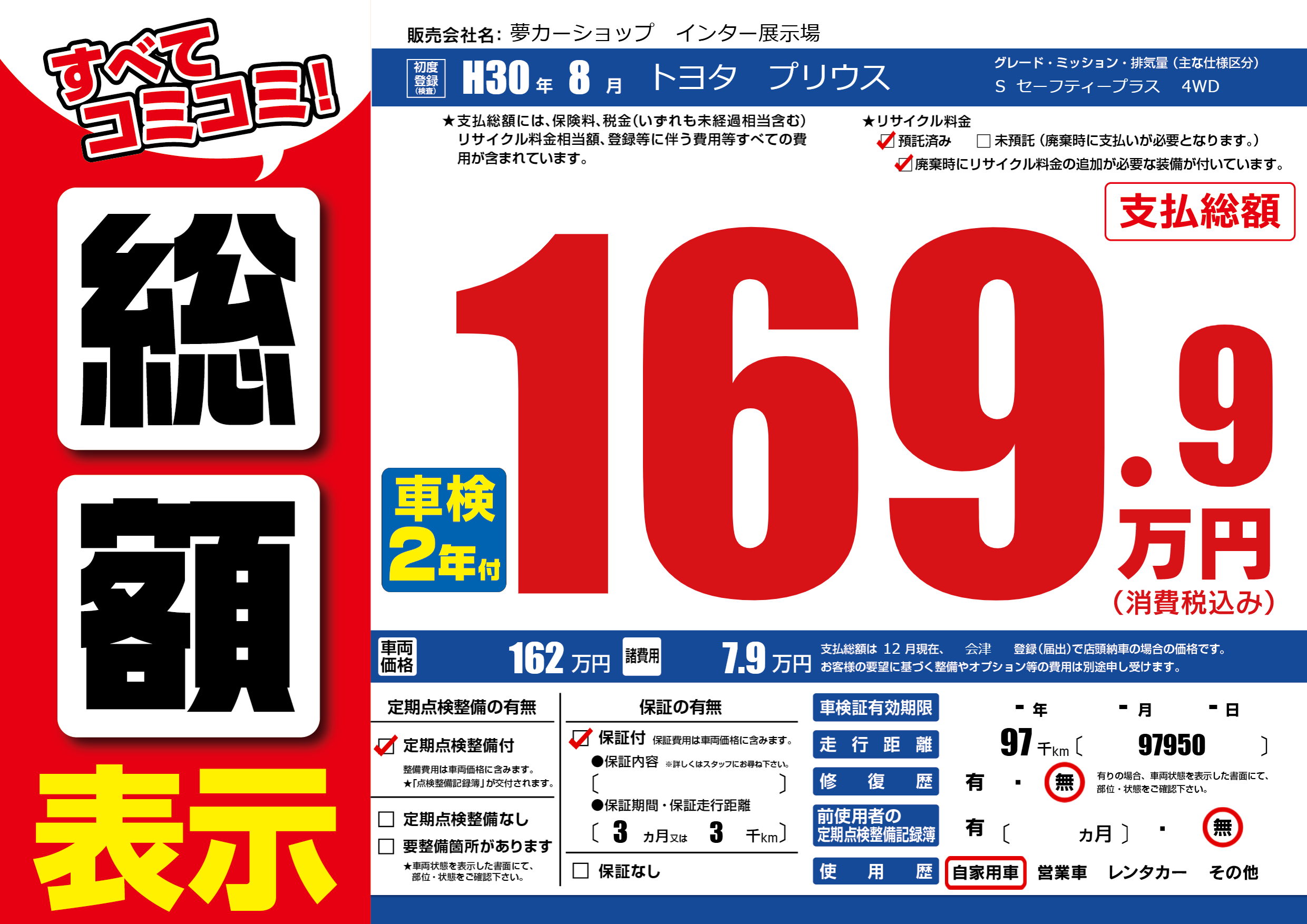 | 車名 | トヨタ プリウス | グレード ミッション 排気量 |