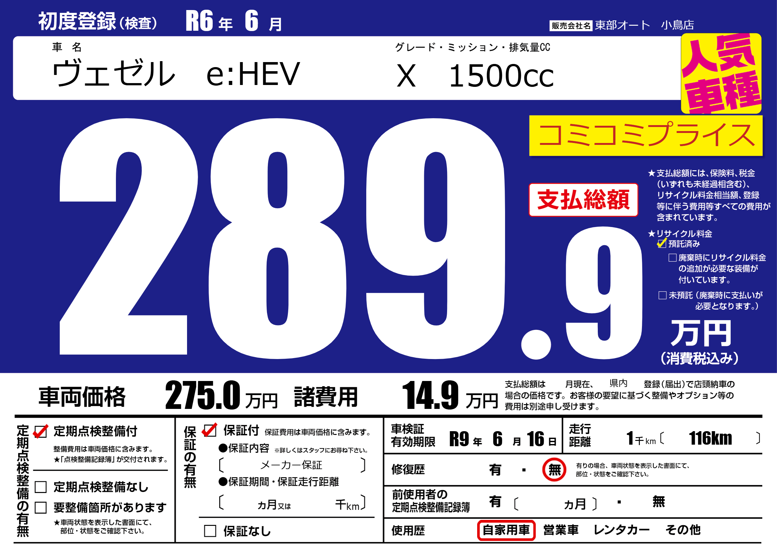 | 車名 | ヴェゼル e:HEV | グレード ミッション 排気量 |
