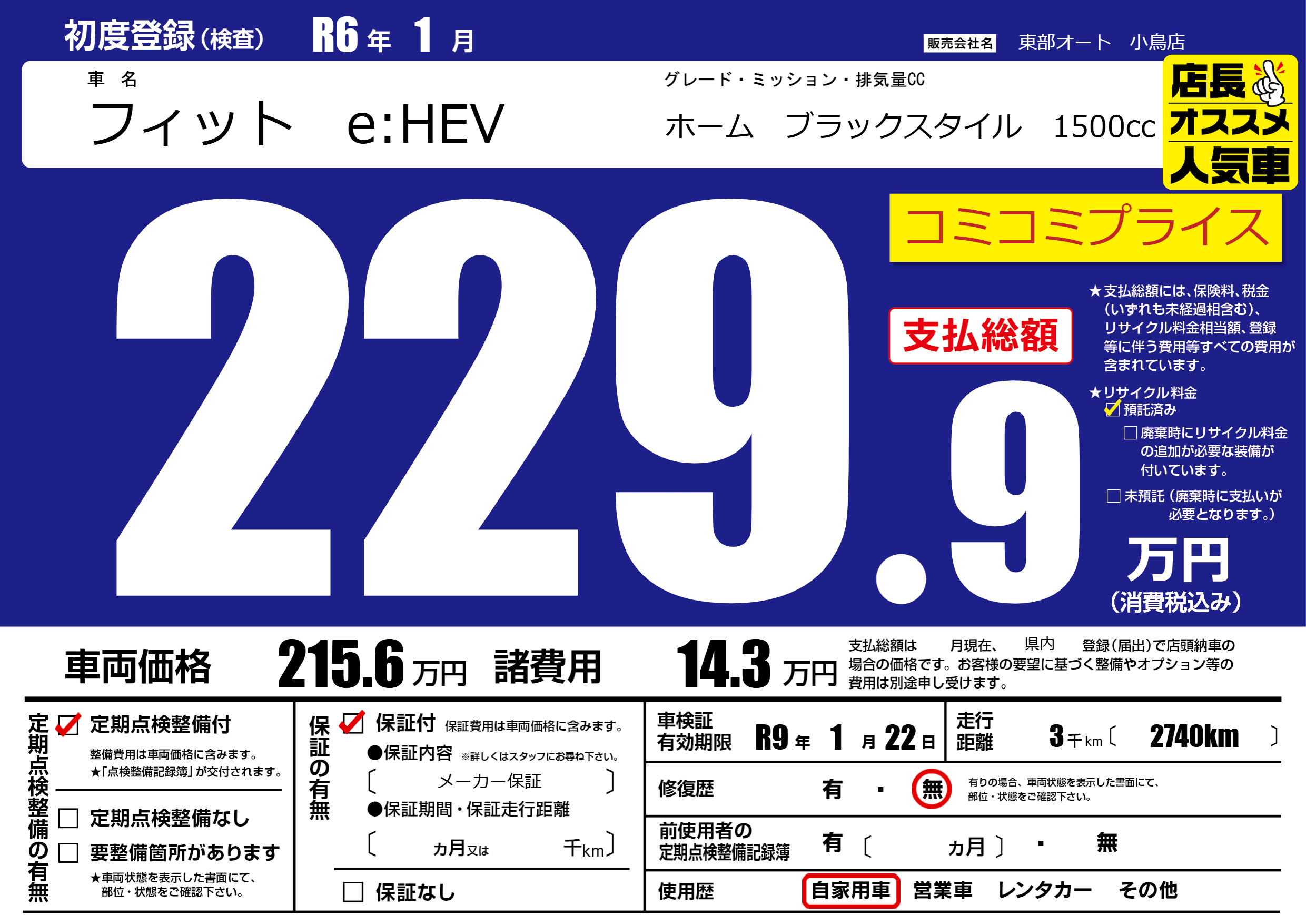 | 走行キロ | 0.3万km | 初年度登録 | R6年1月 |