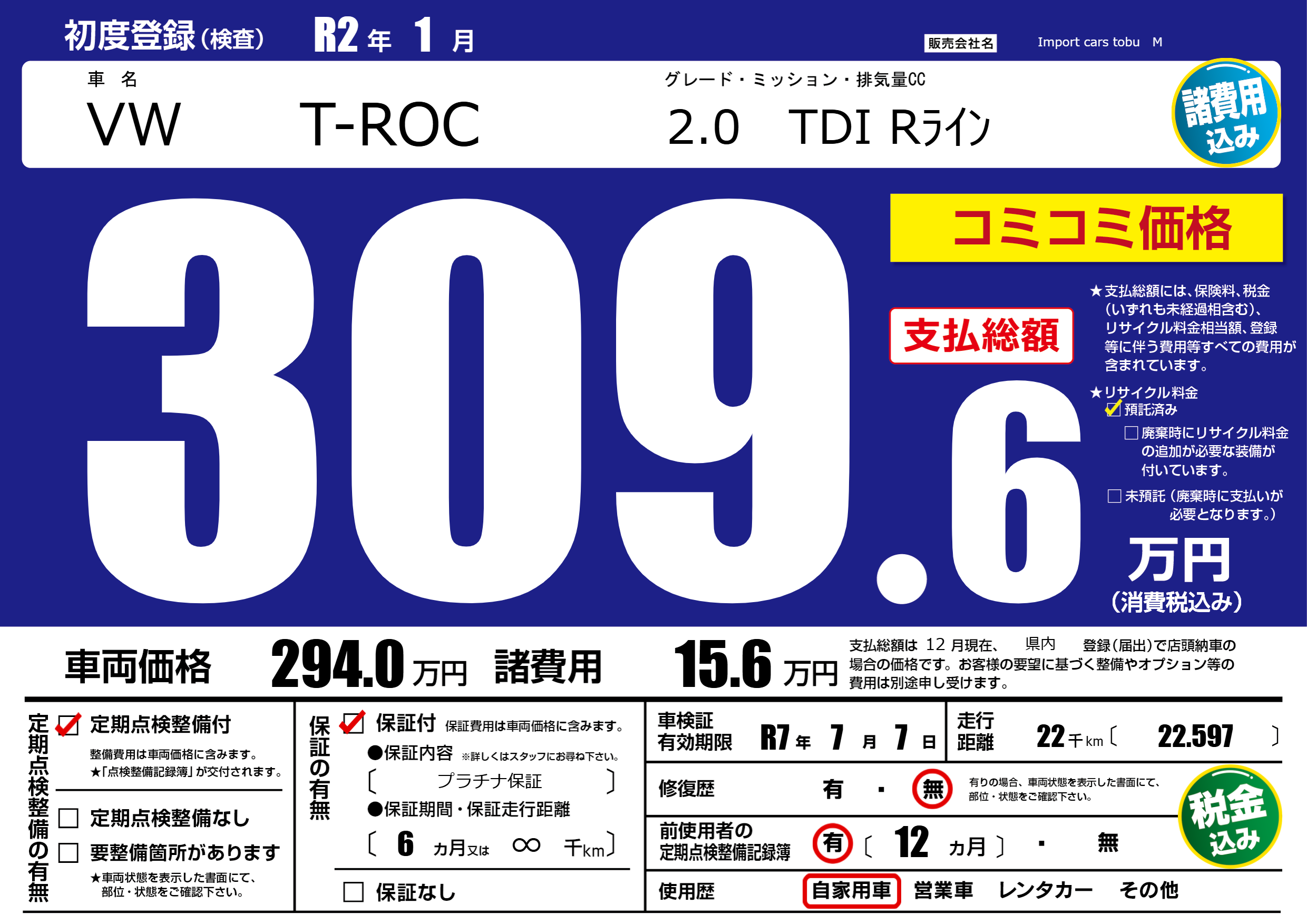 | 車名 | VW T‐ROC | グレード ミッション 排気量 |