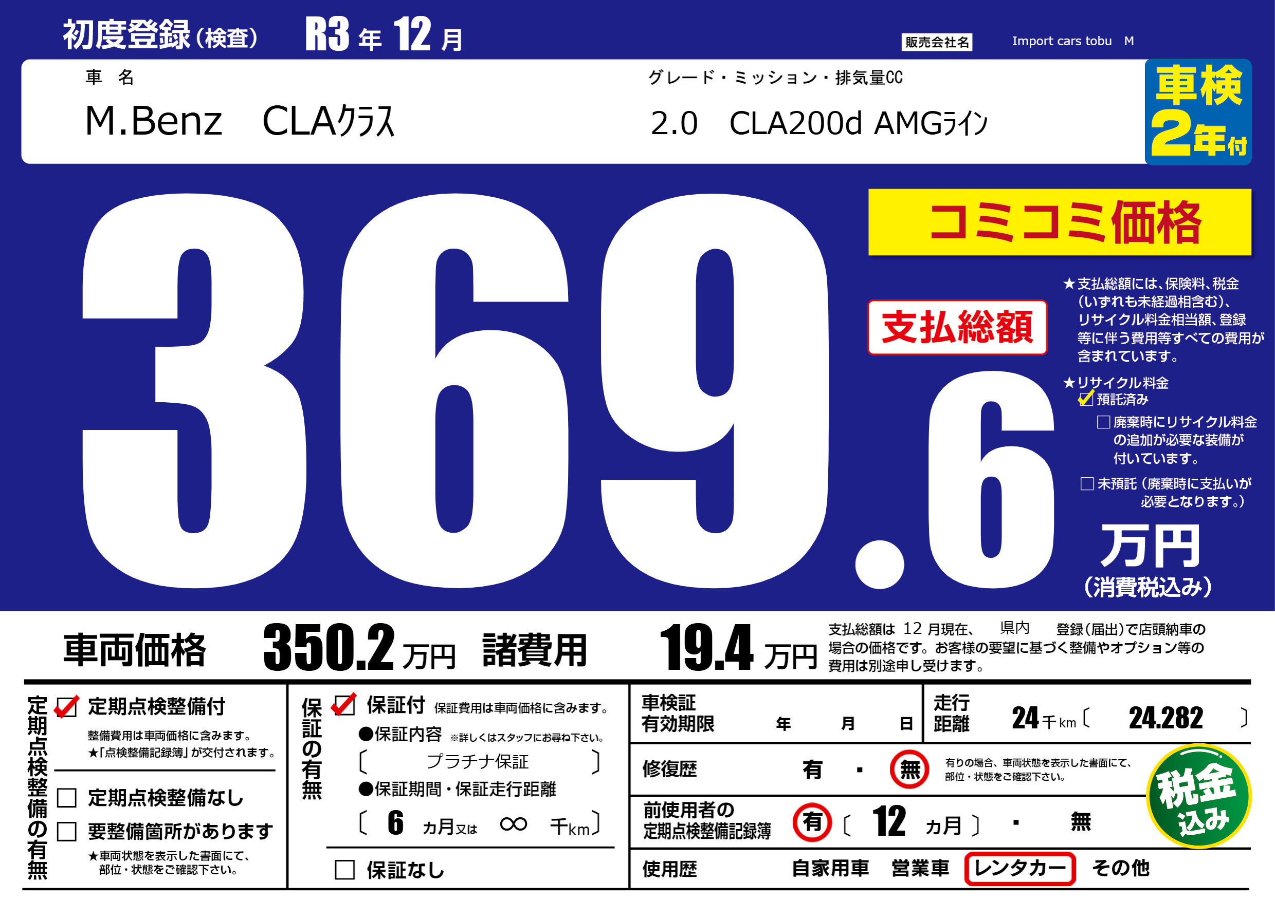 | 車名 | M.Benz CLAクラス | グレード ミッション 排気量 |