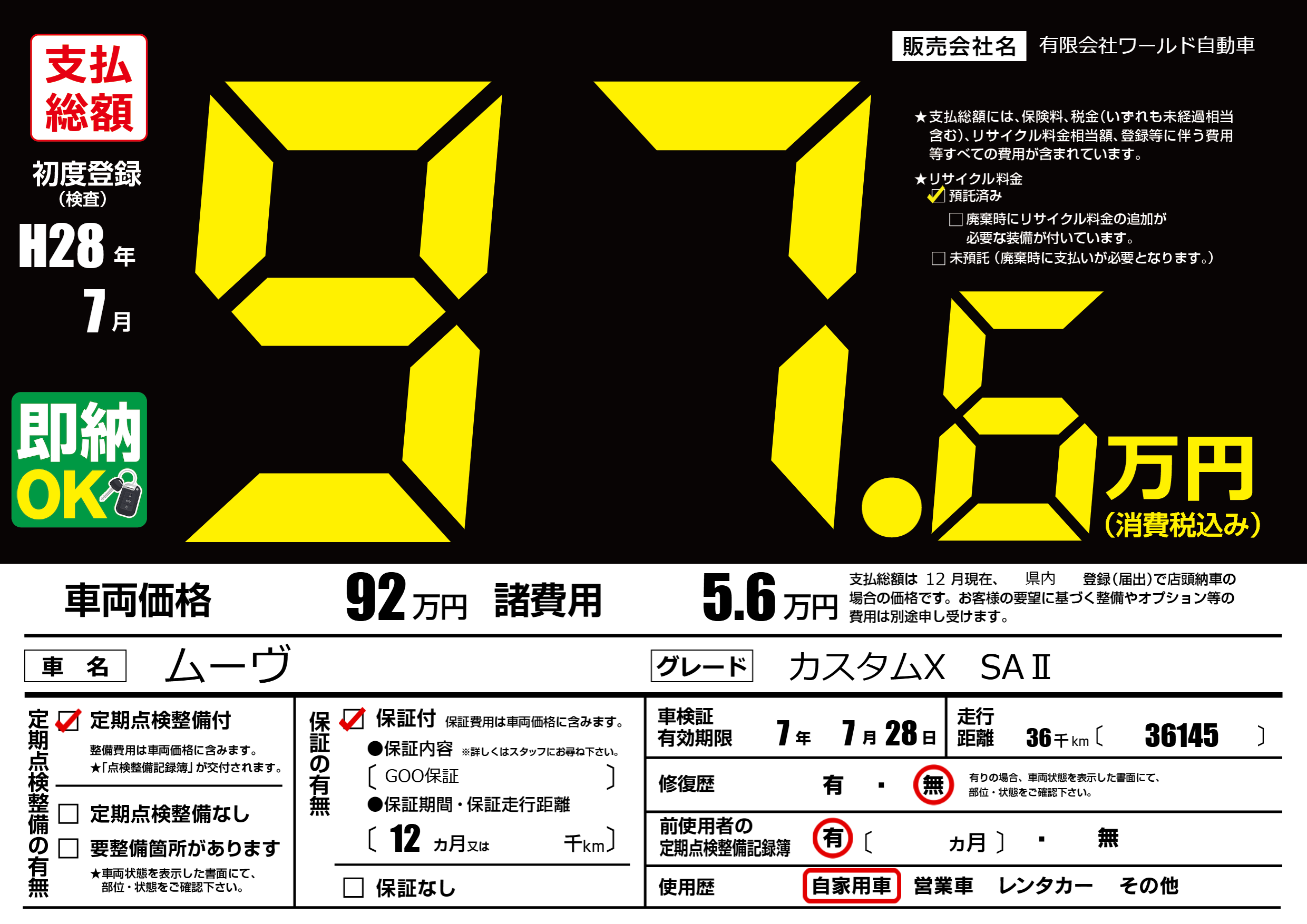 | 走行キロ | 3.6万km | 初年度登録 | H28年7月 |