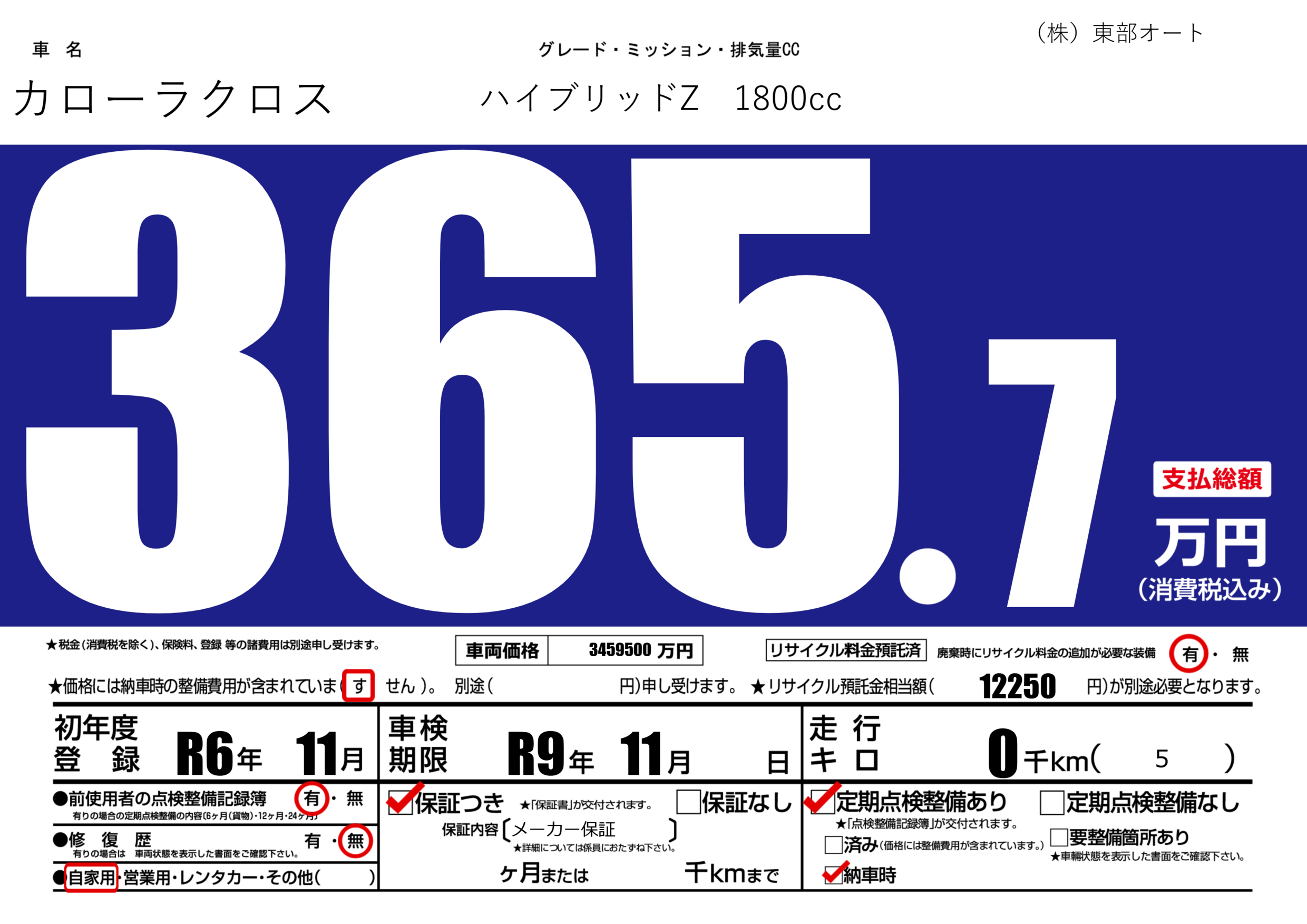 | 車名 | カローラクロス | グレード ミッション 排気量 |