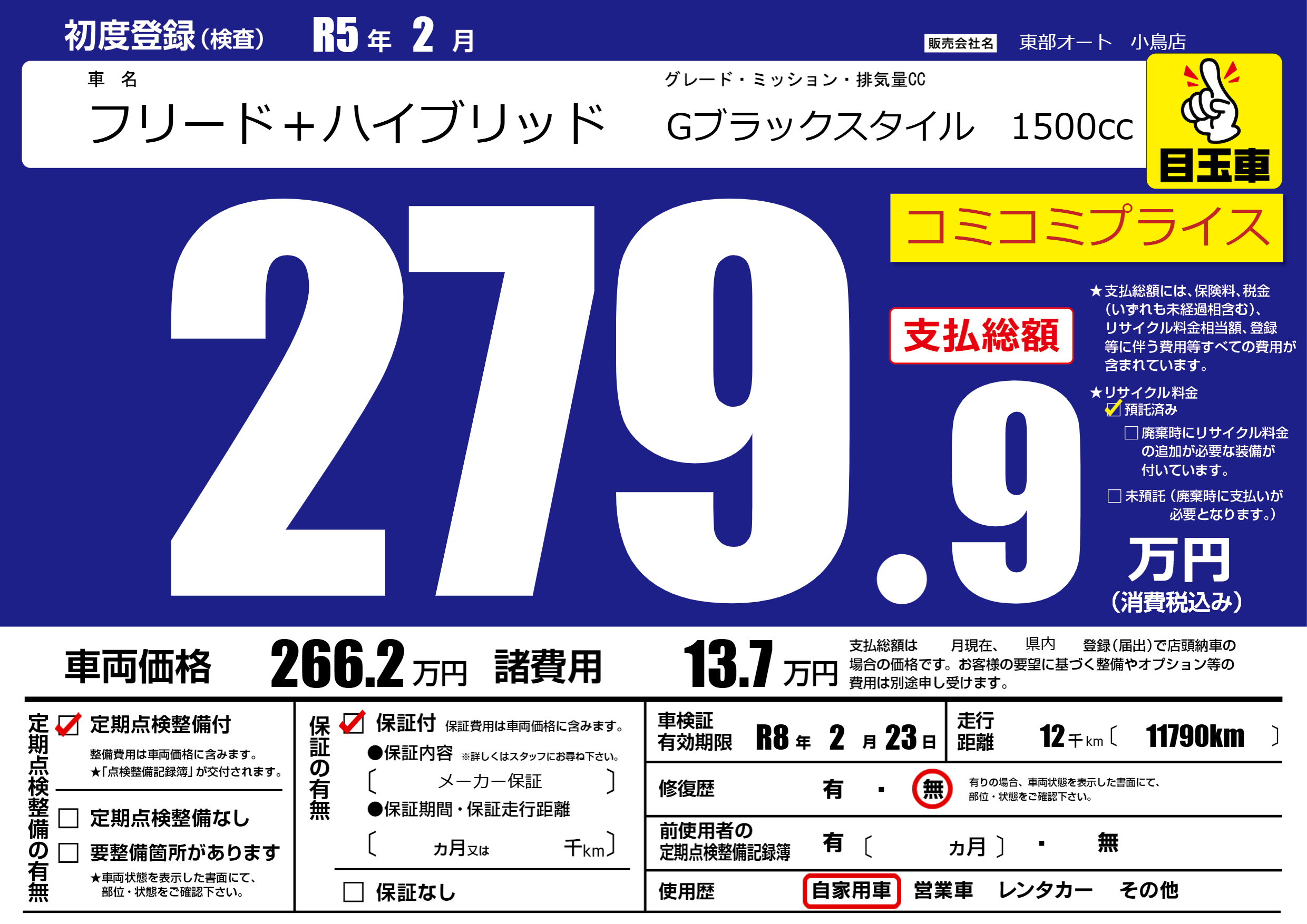 | 車名 | フリード+ハイブリッド | グレード ミッション 排気量 |