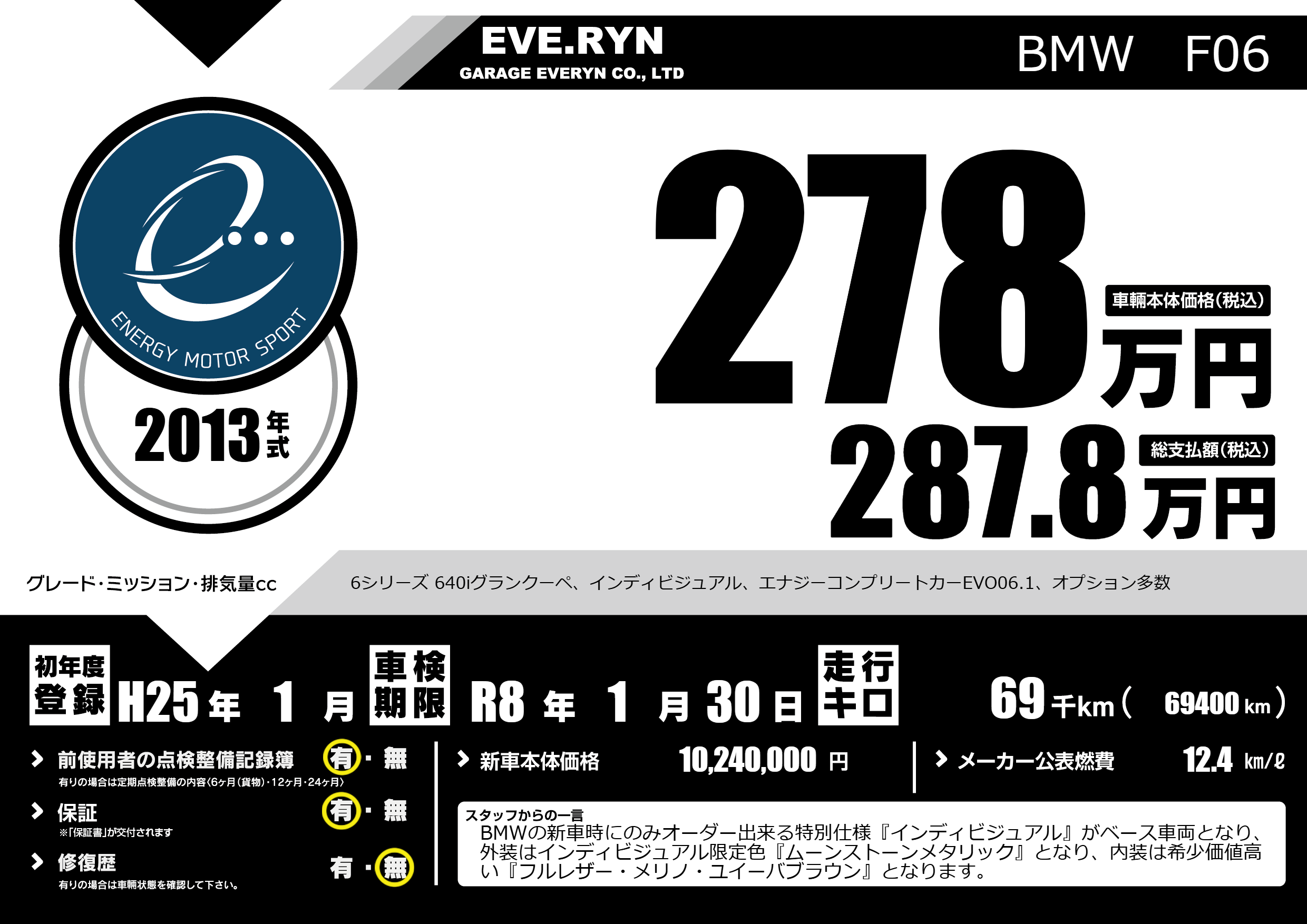 6シリーズ 640iグランクーペ、インディビジュアル、エナジーコンプリートカーEVO06.1、オプション多数 |