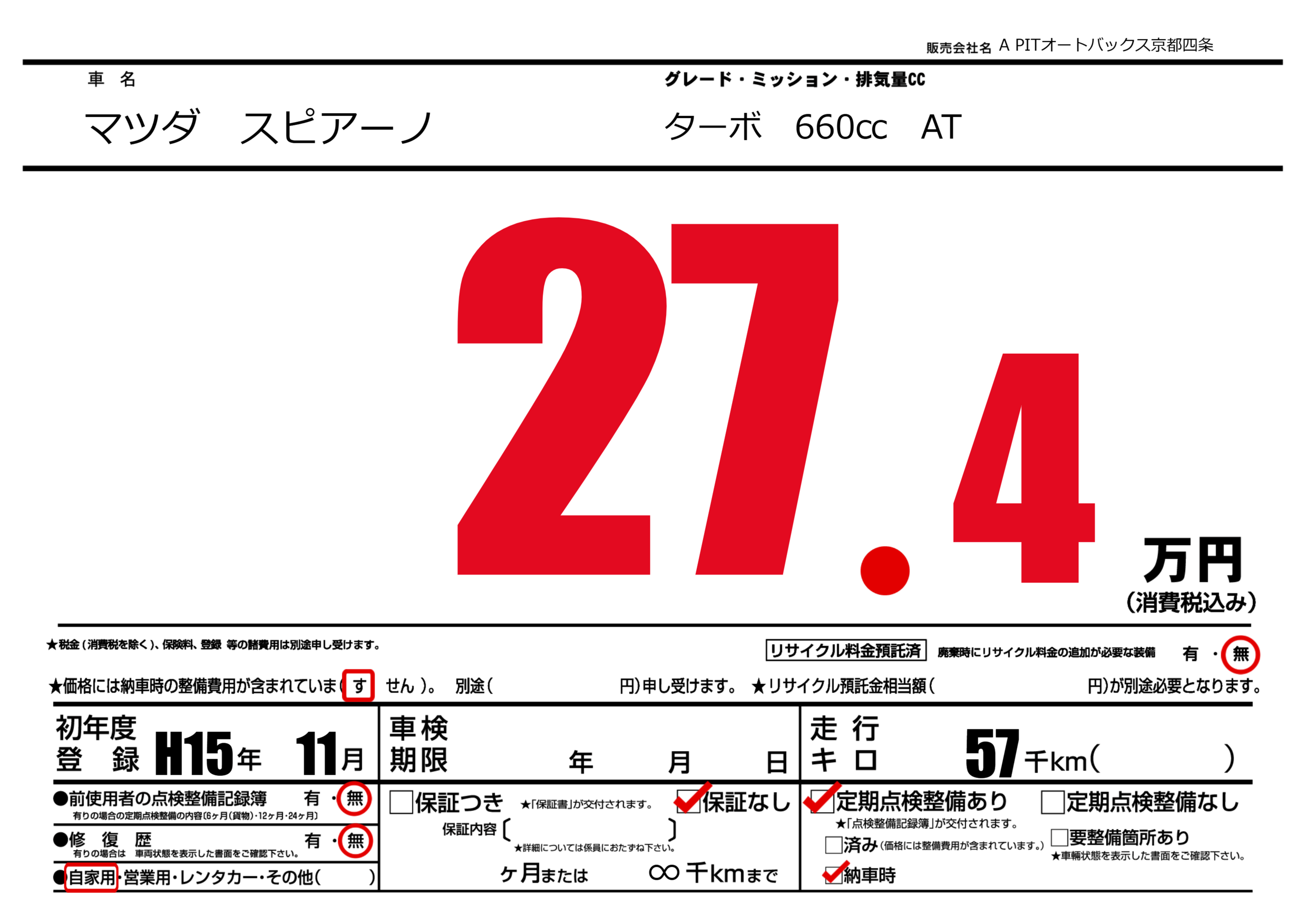 | 車名 | マツダ スピアーノ | グレード ミッション 排気量 |