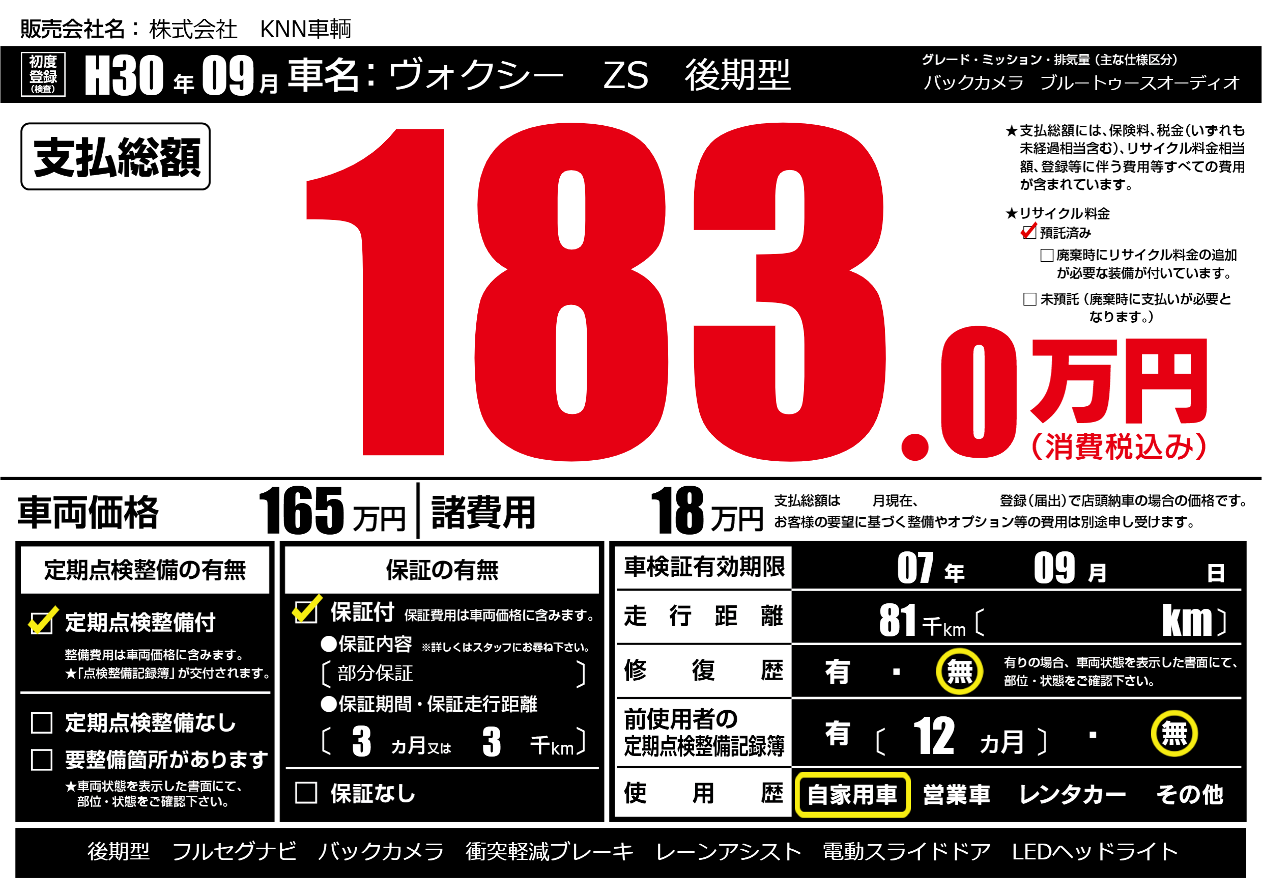 | 車名 | ヴォクシー ZS 後期型 | グレード ミッション 排気量 |