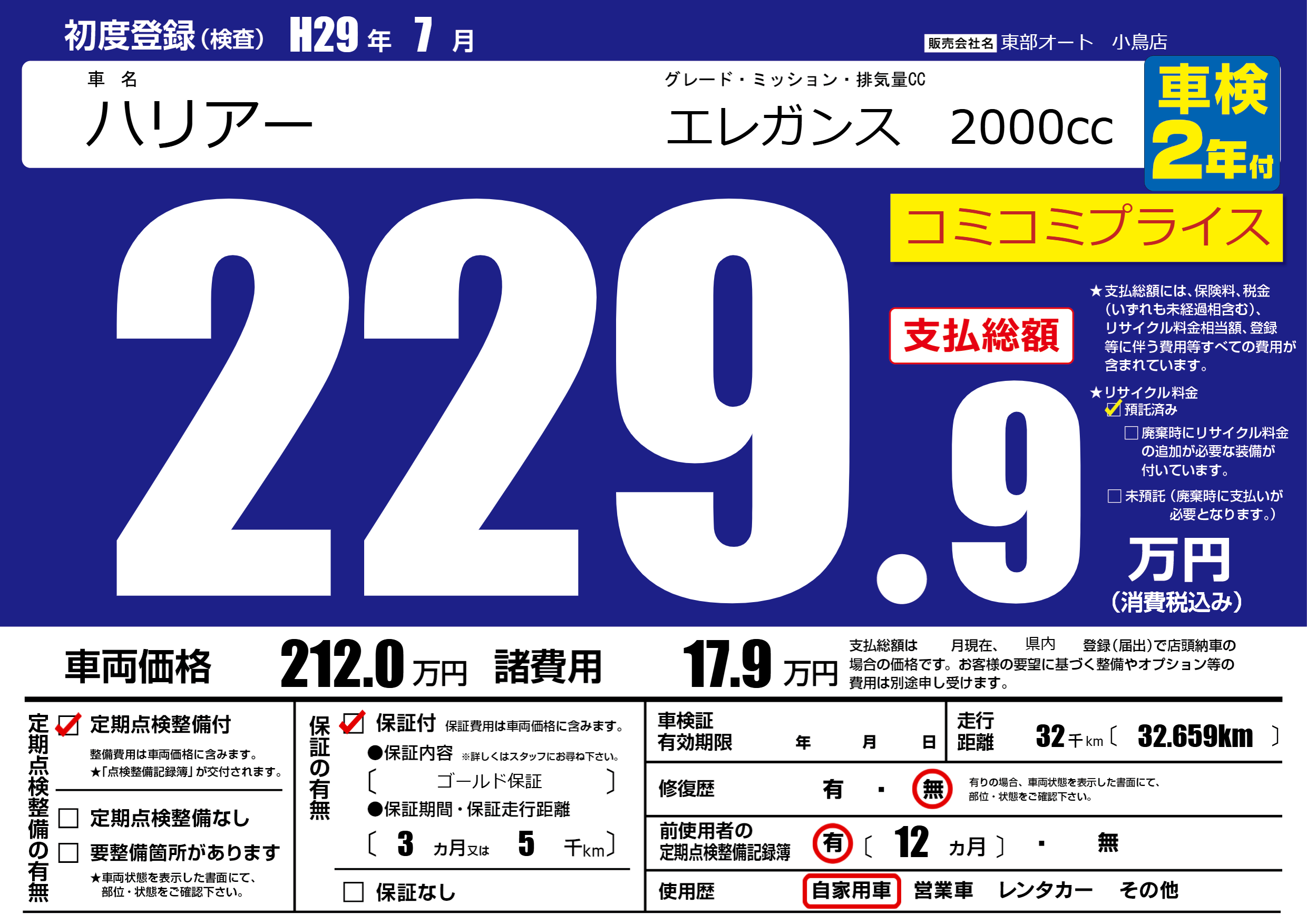 | 走行キロ | 3.2万km | 初年度登録 | H29年7月 |