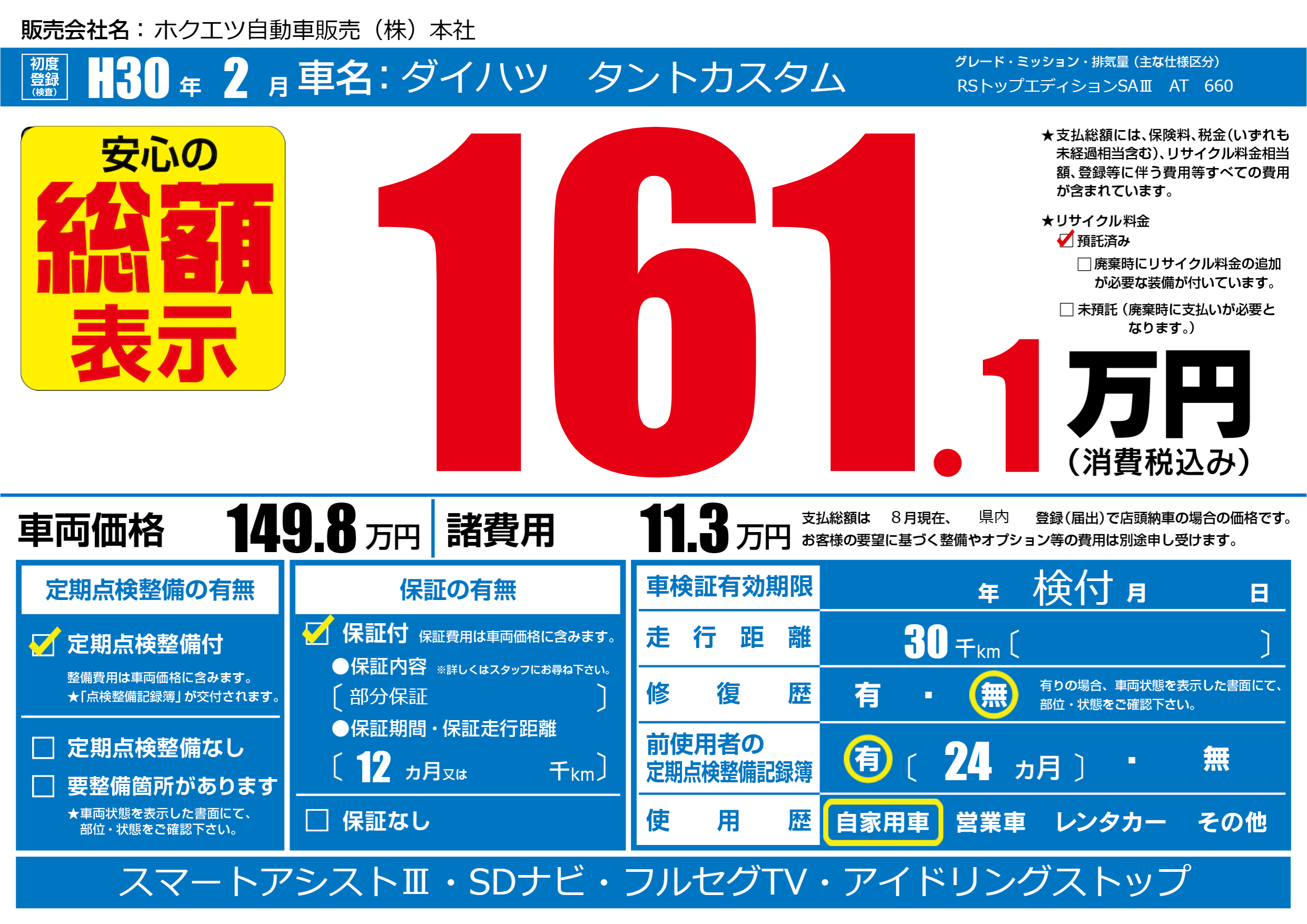 | 走行キロ | 3万km | 初年度登録 | H30年2月 |