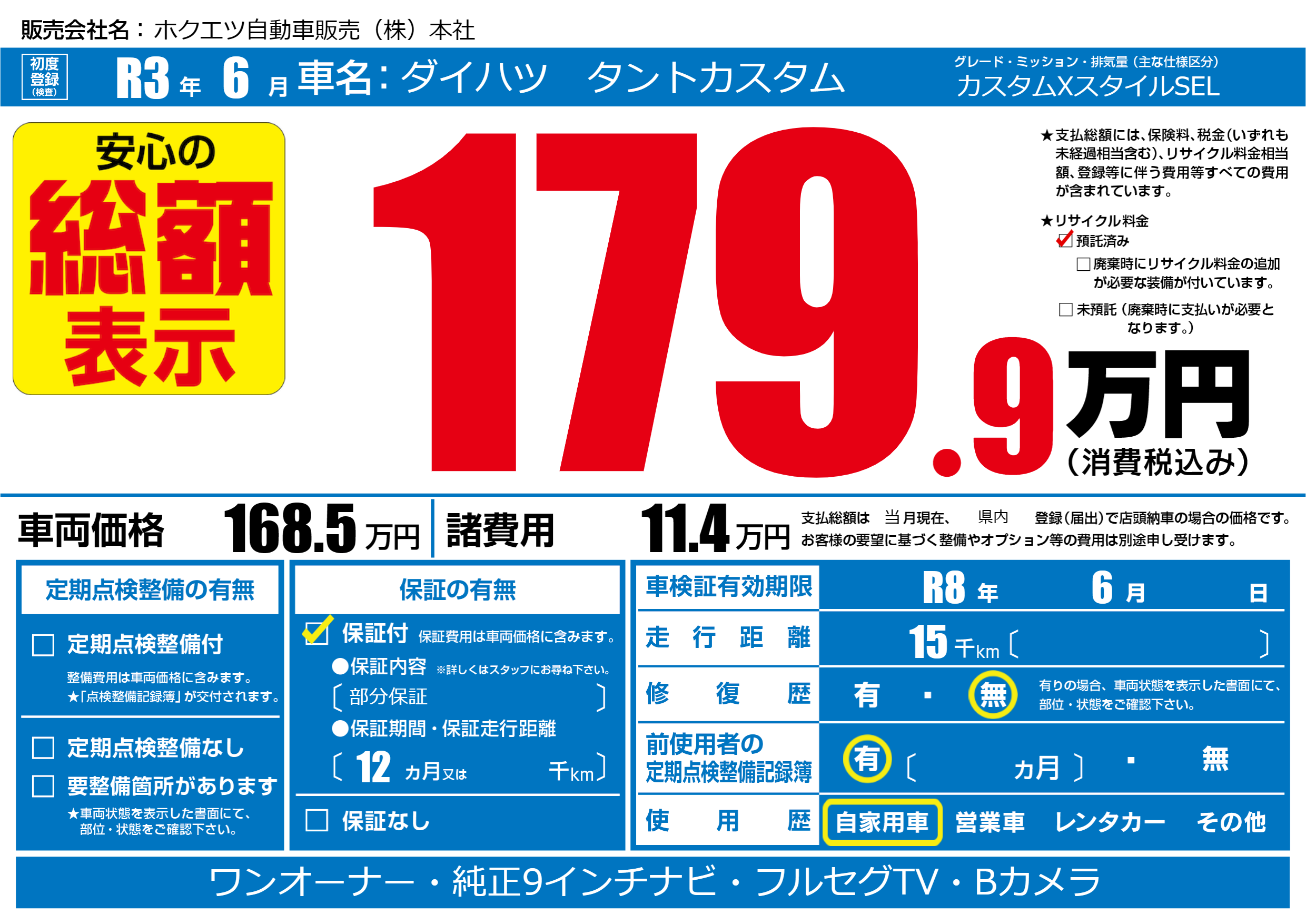 | 走行キロ | 1.5万km | 初年度登録 | R3年6月 |