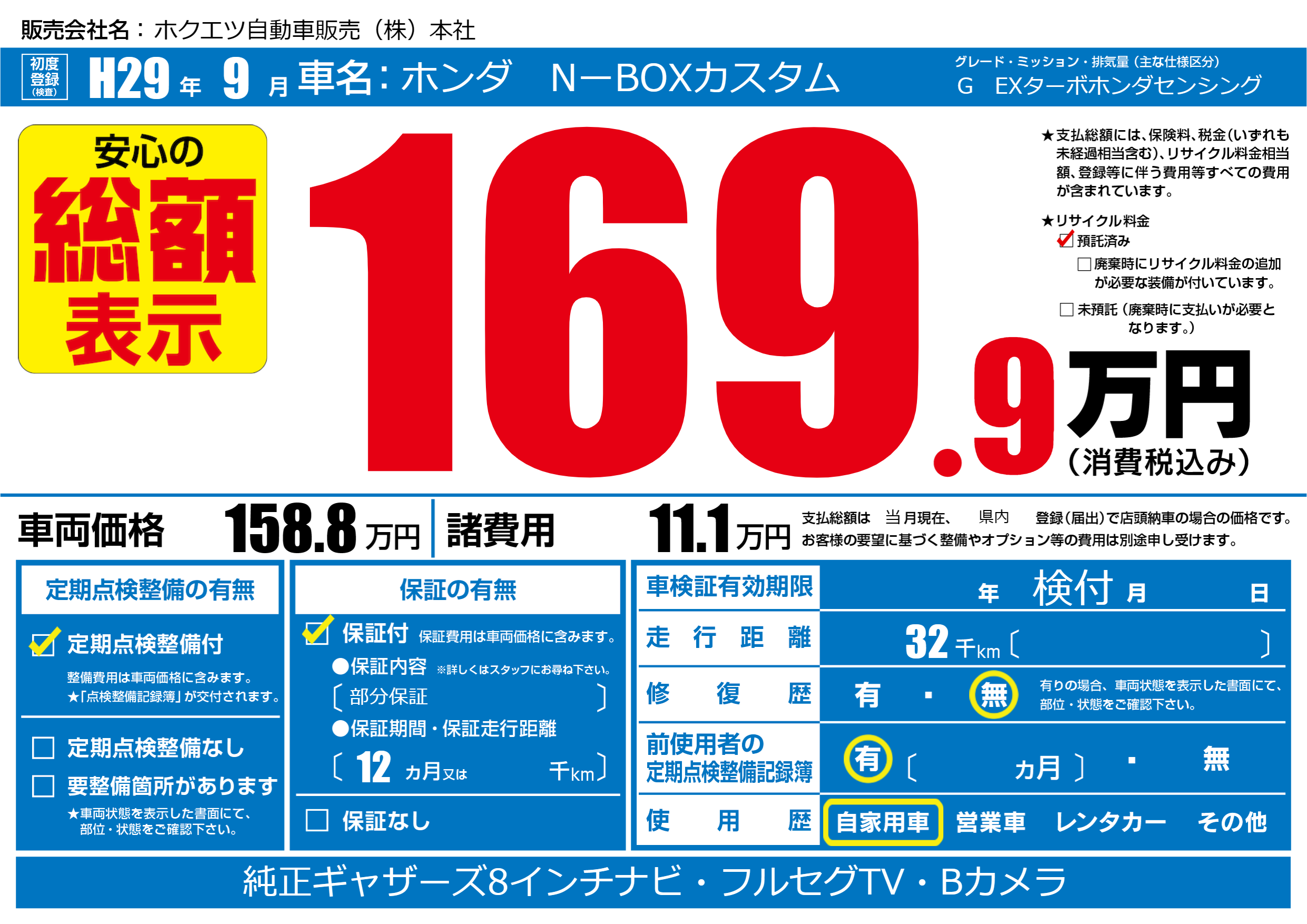 | 車名 | ホンダ NーBOXカスタム | グレード ミッション 排気量 |