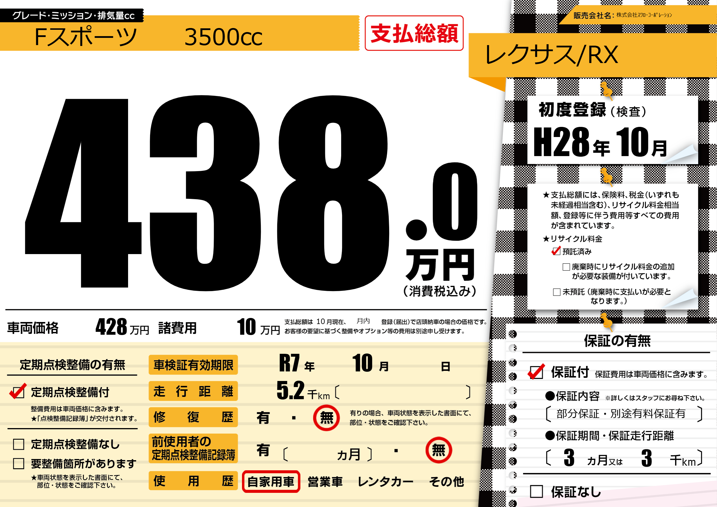 | 車名 | レクサス/RX | グレード ミッション 排気量 |