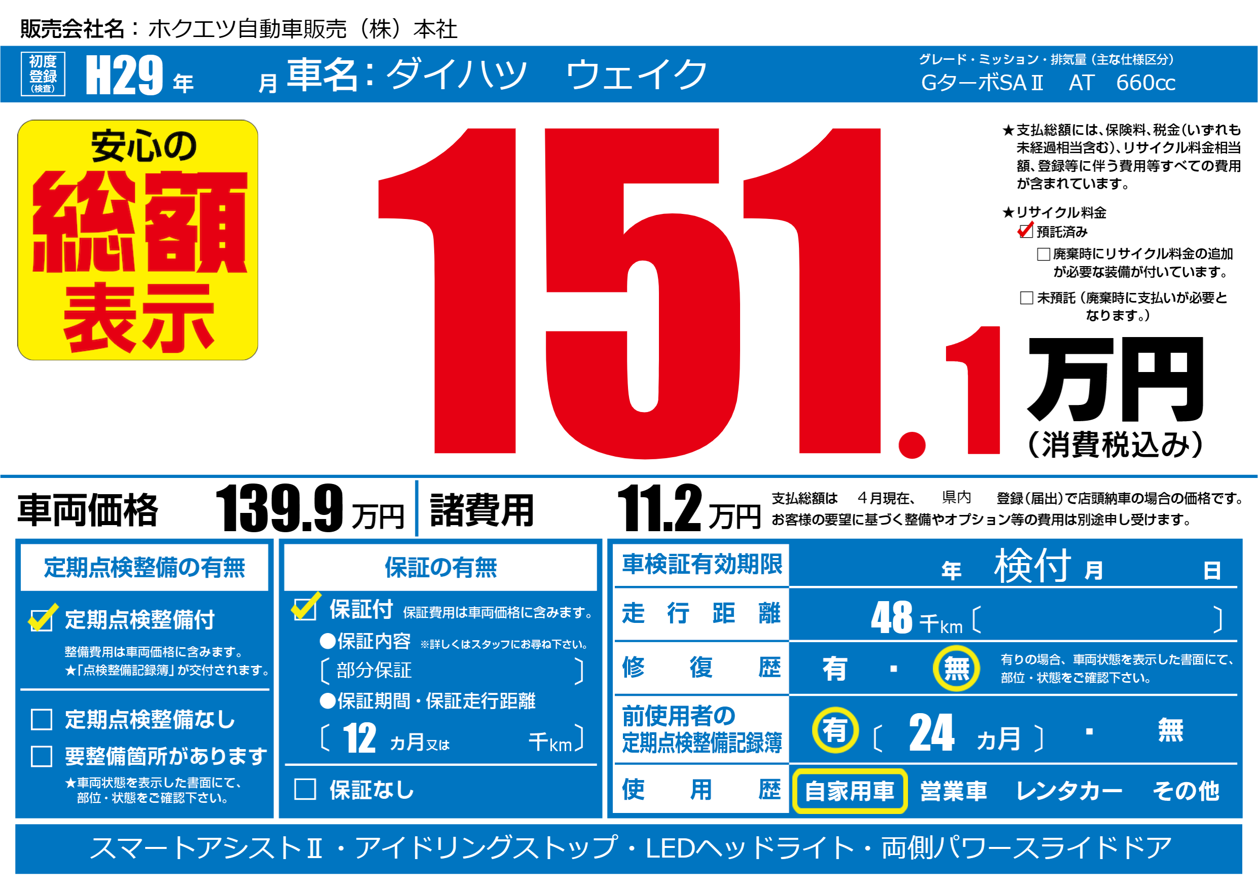 | 車名 | ダイハツ ウェイク | グレード ミッション 排気量 |