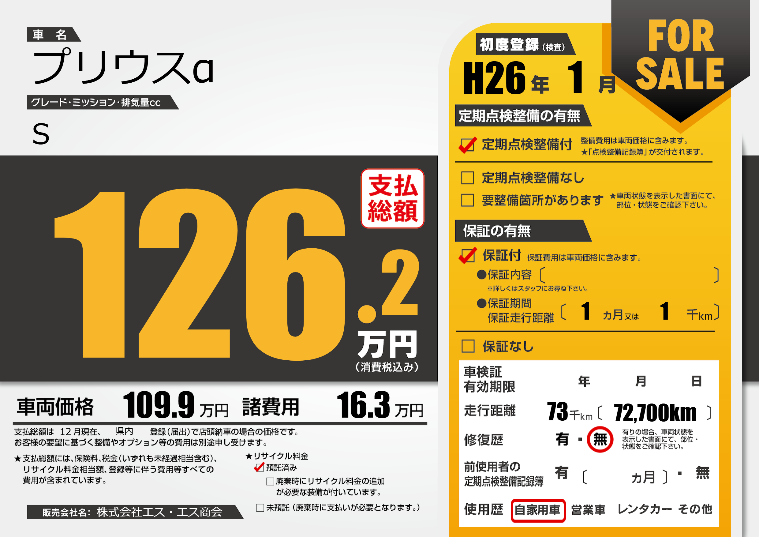 | 走行キロ | 7.3万km | 初年度登録 | H26年1月 |