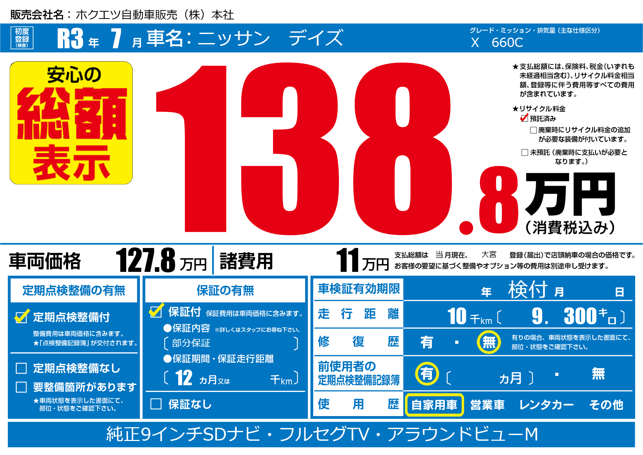 | 車名 | ニッサン デイズ | グレード ミッション 排気量 |