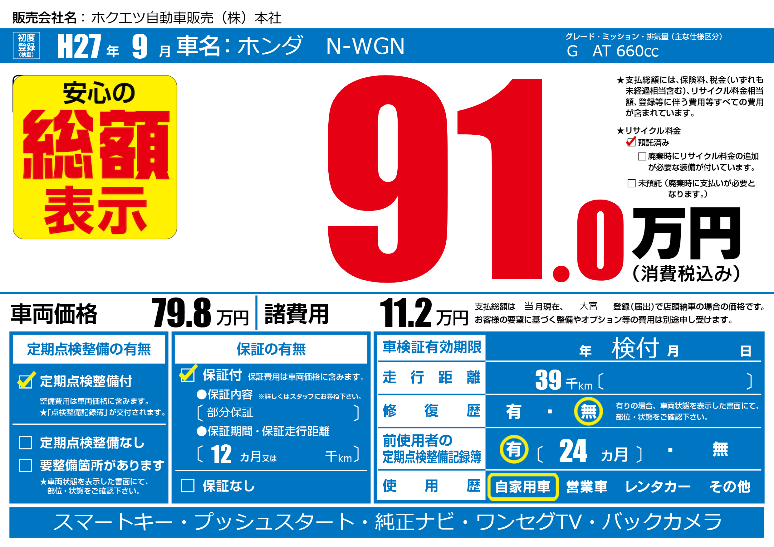 | 車名 | ホンダ N-WGN | グレード ミッション 排気量 |