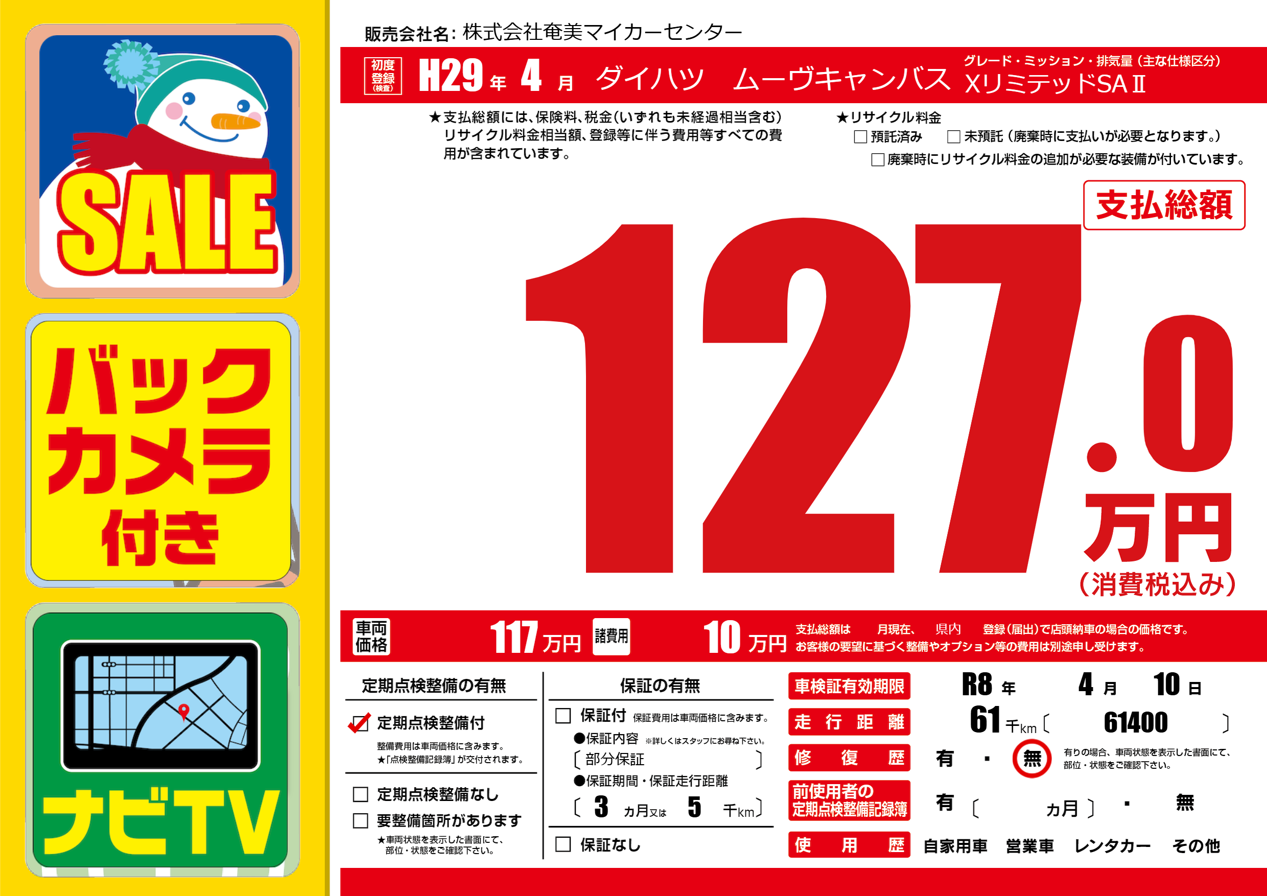 | 走行キロ | 6.1万km | 初年度登録 | H29年4月 |