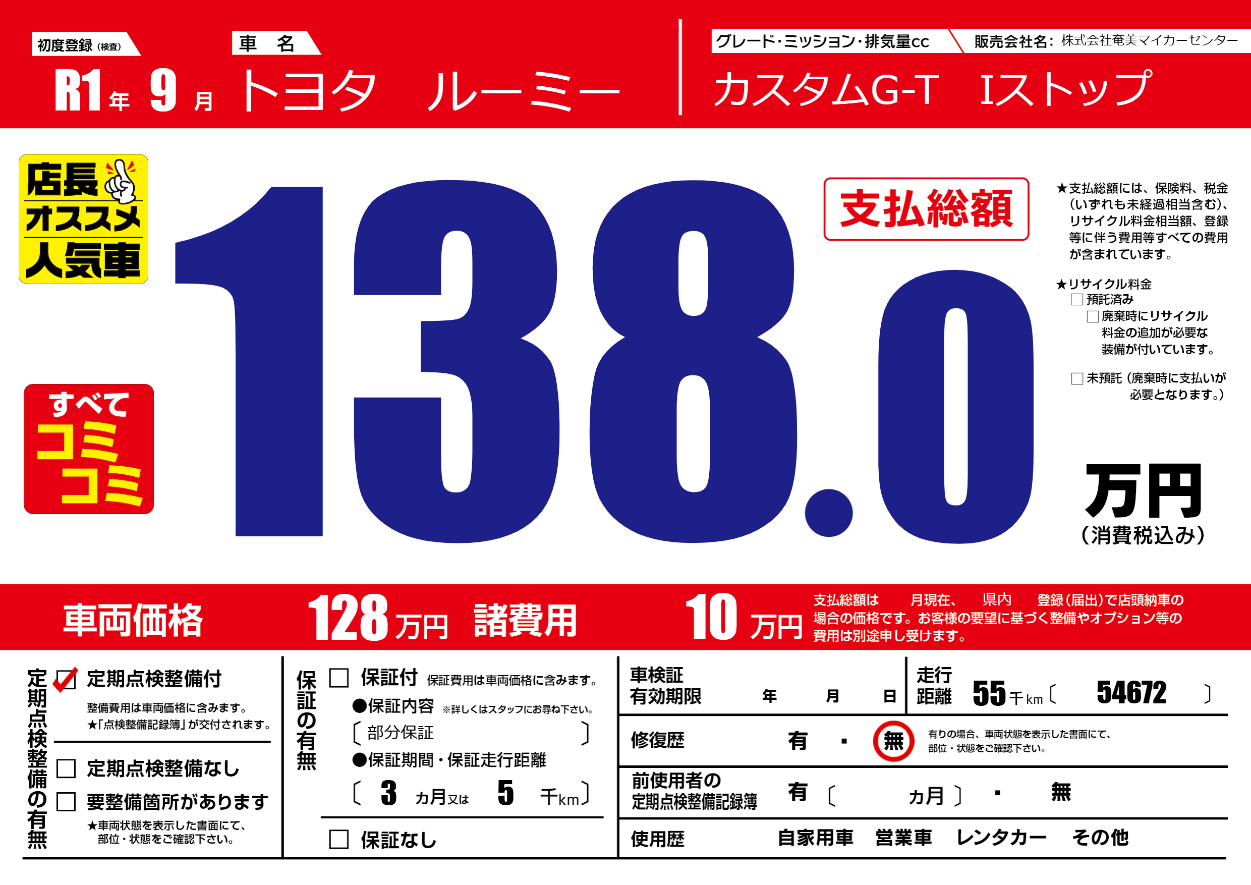 | 車名 | トヨタ ルーミー | グレード ミッション 排気量 |