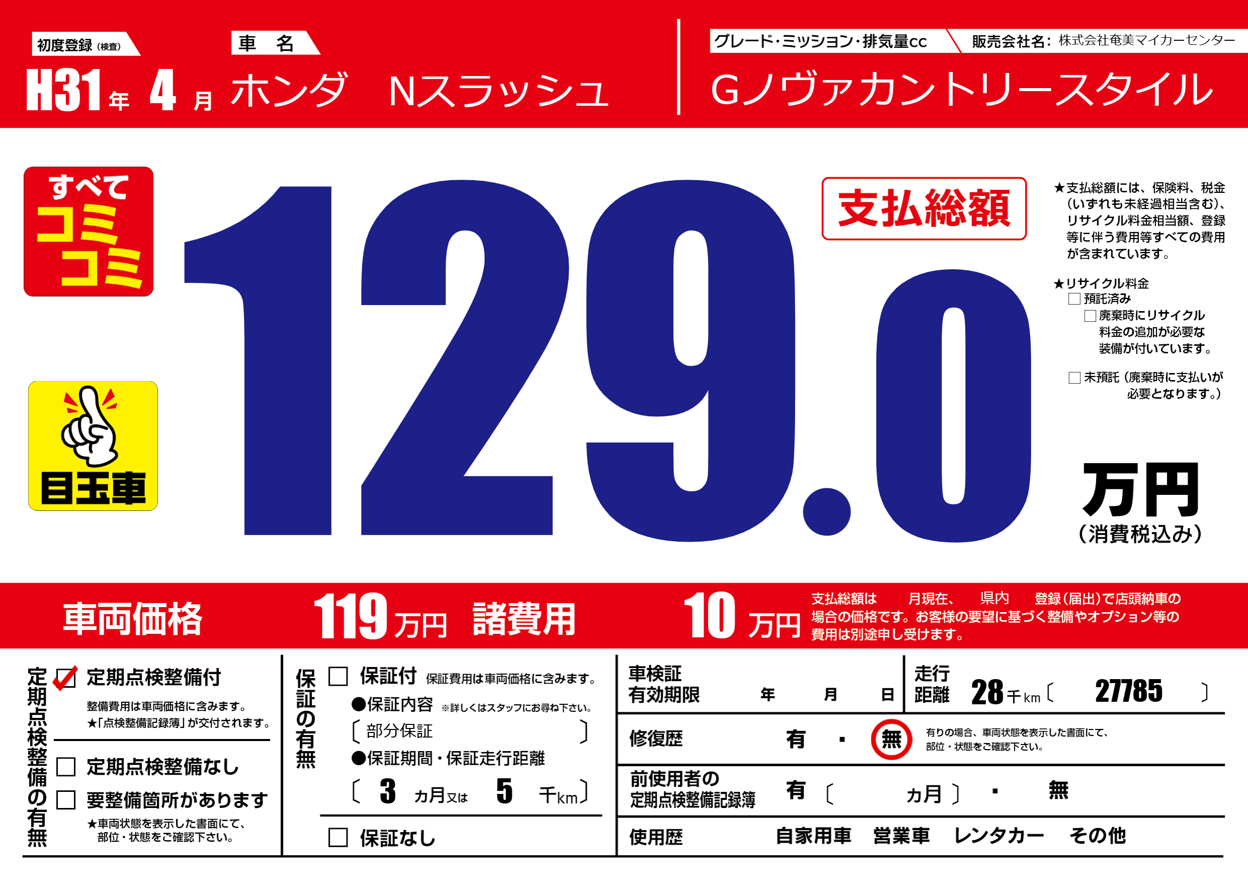 | 走行キロ | 2.8万km | 初年度登録 | H31年4月 |