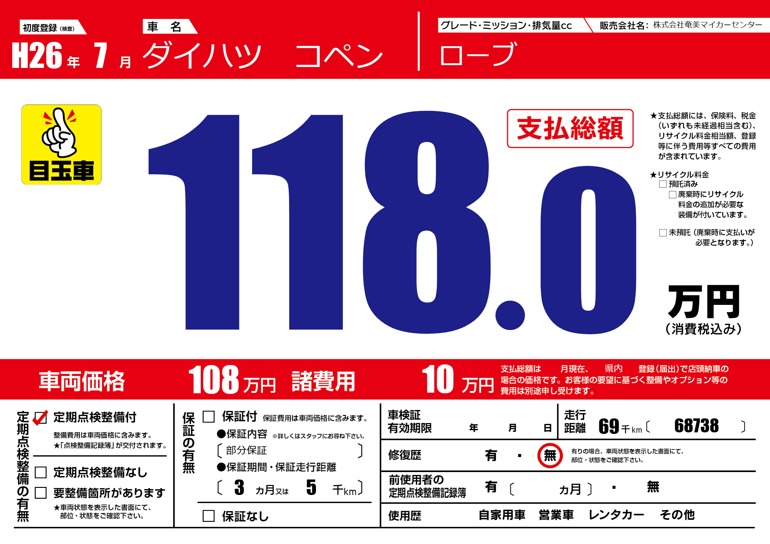 | 車名 | ダイハツ コペン | グレード ミッション 排気量 |