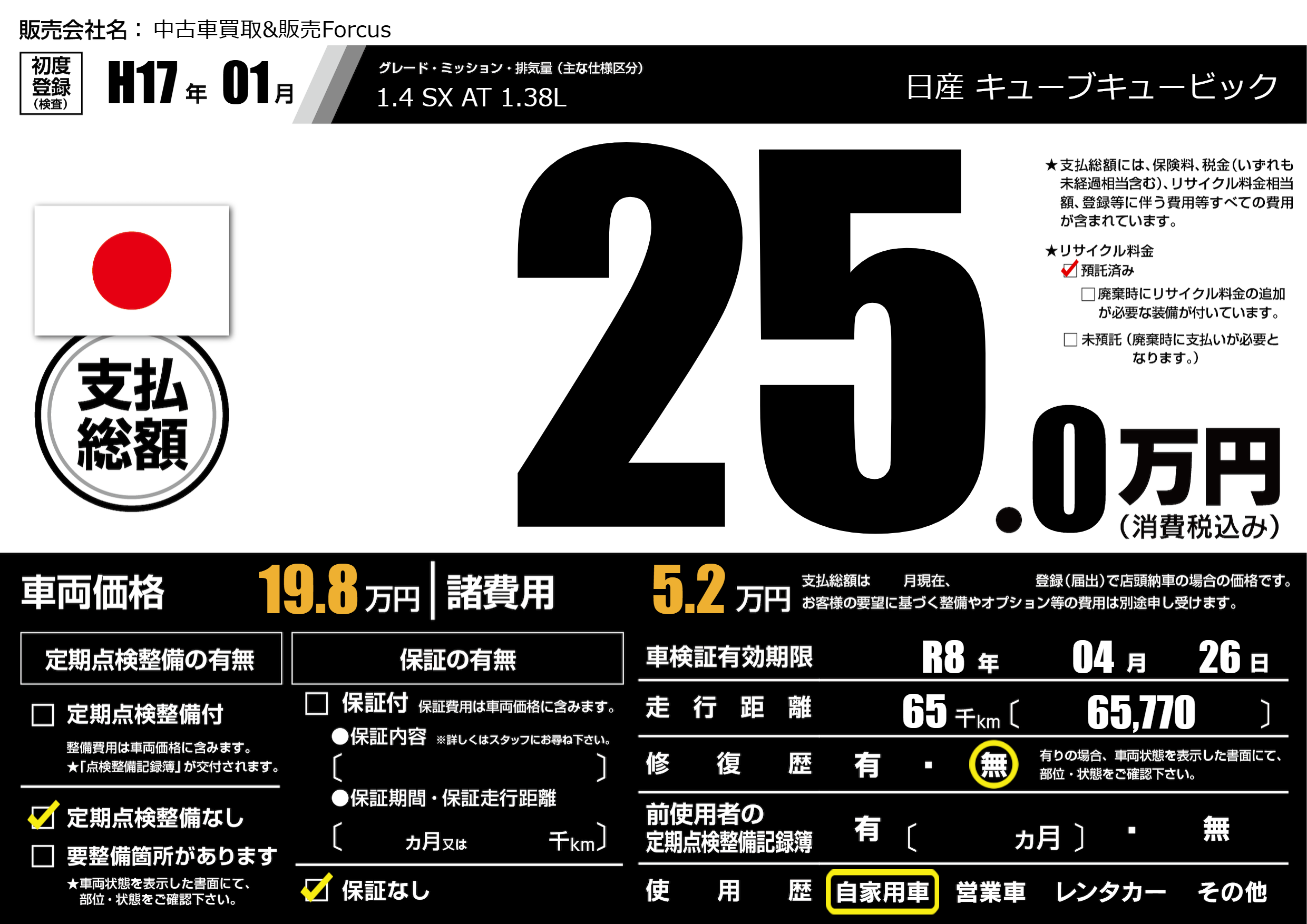 | 車名 | 日産 キューブキュービック | グレード ミッション 排気量 |
