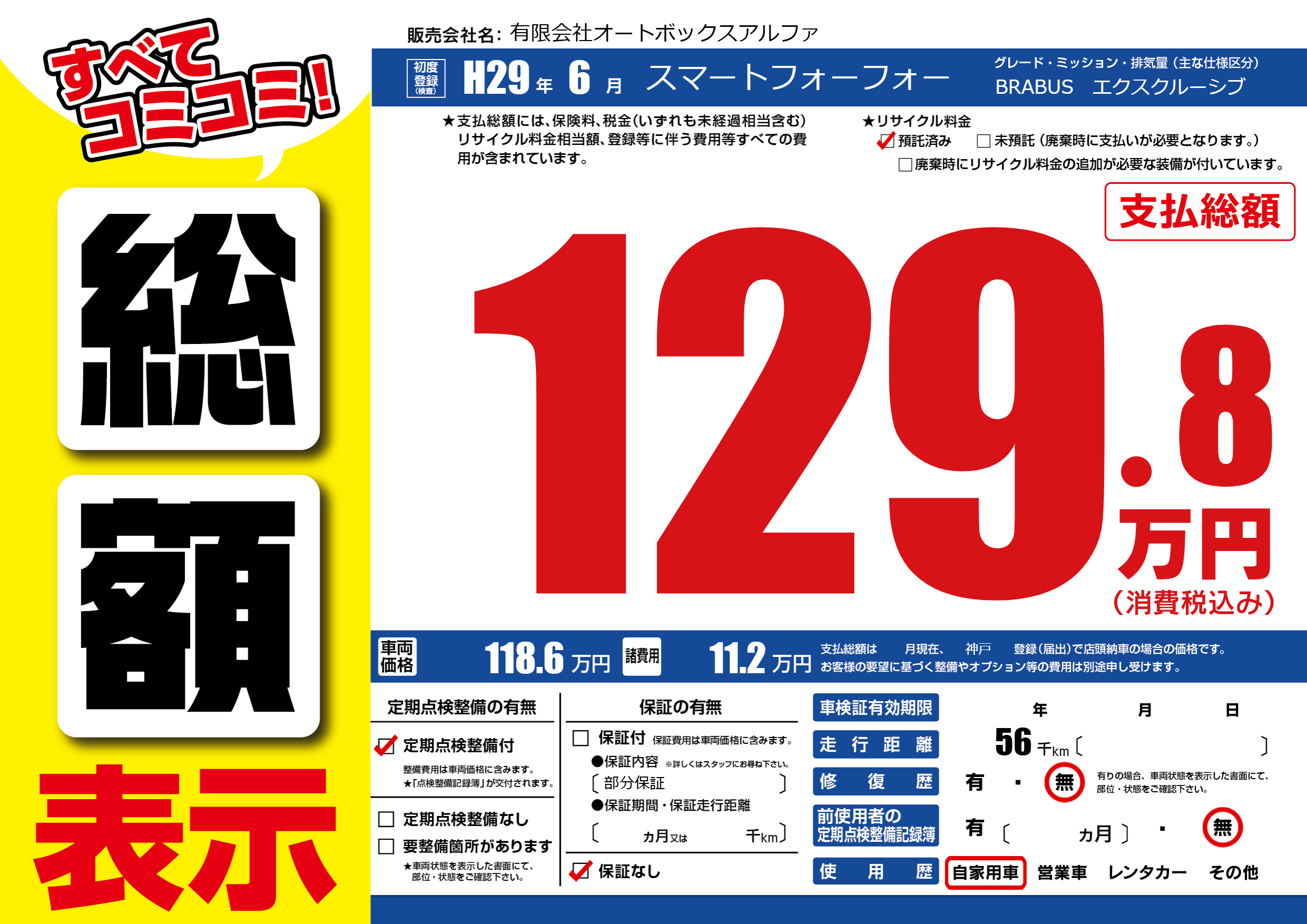 | 車名 | スマートフォーフォー | グレード ミッション 排気量 |