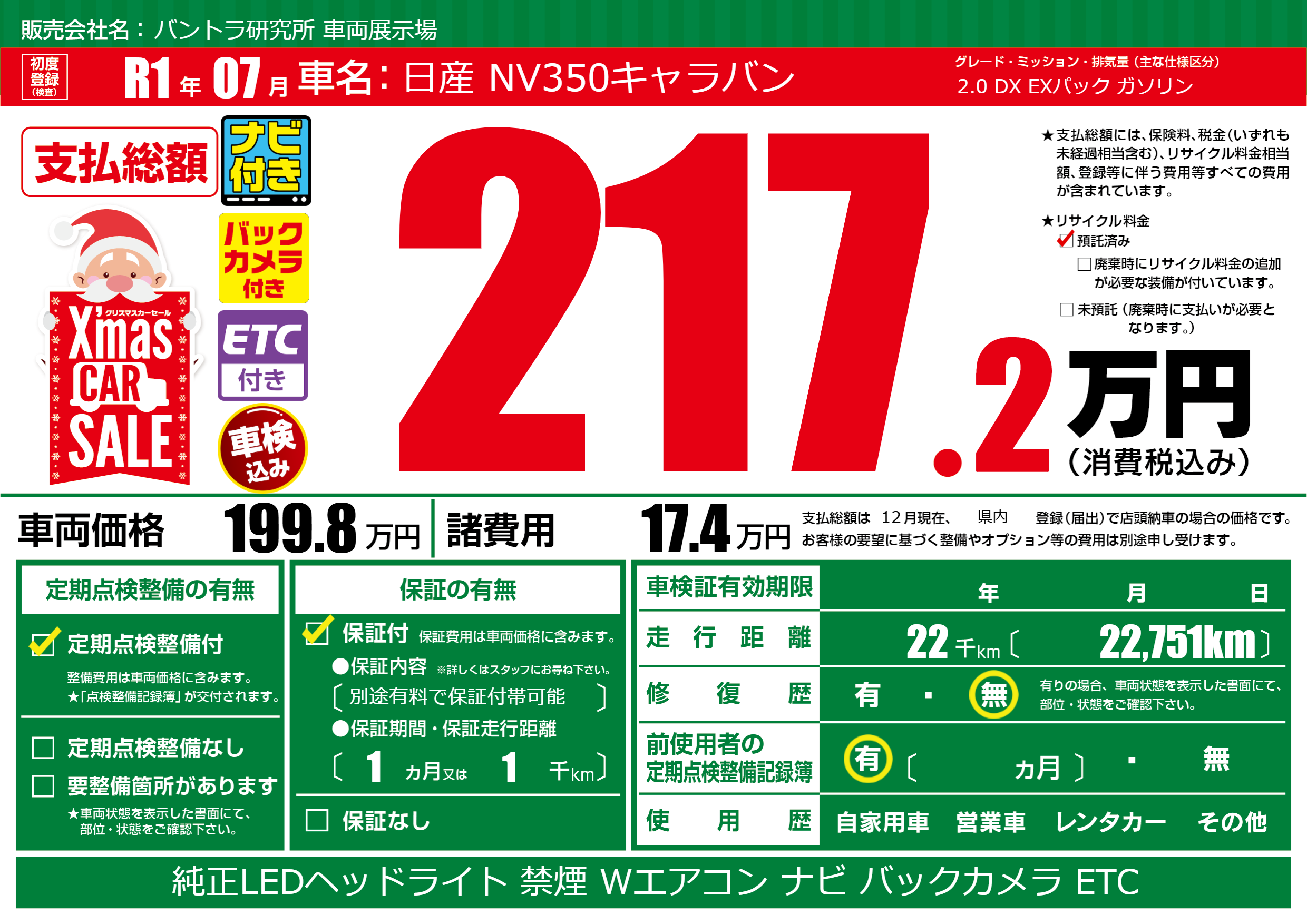 | 車名 | 日産 NV350キャラバン | グレード ミッション 排気量 |
