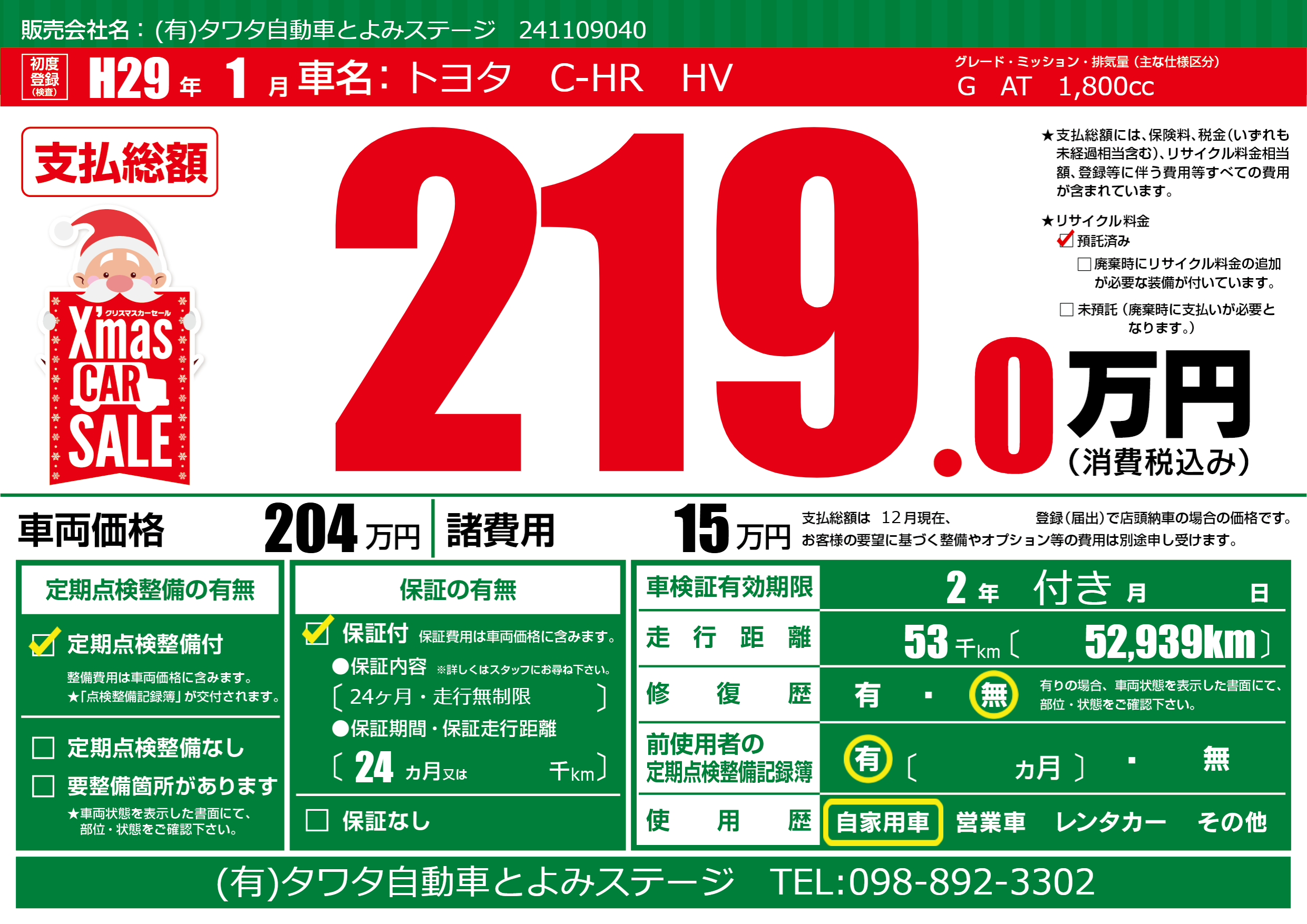 | 車名 | トヨタ C-HR HV | グレード ミッション 排気量 |