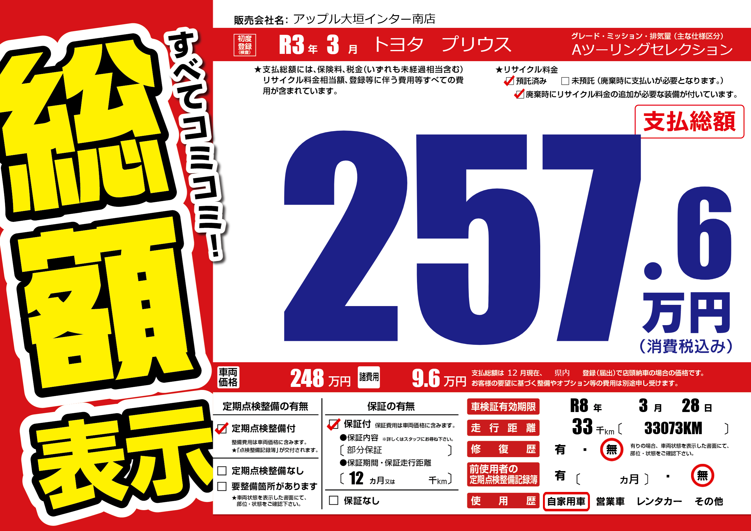 | 車名 | トヨタ プリウス | グレード ミッション 排気量 |