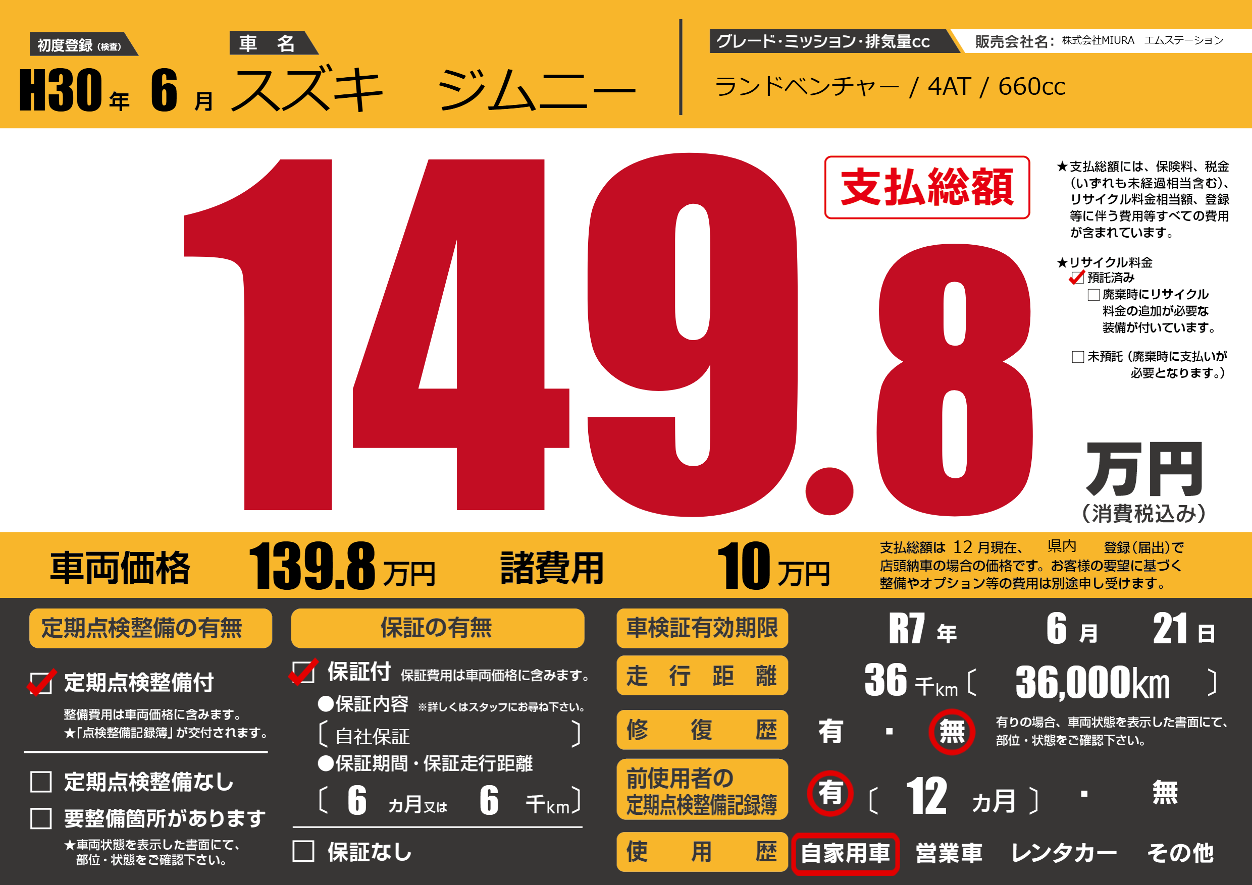 保証付き 保証内容(自社保証) 6ヶ月または6千km |